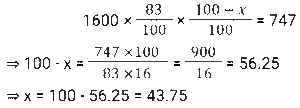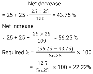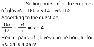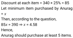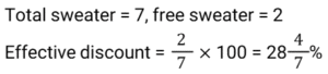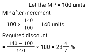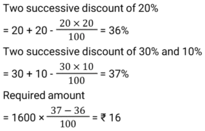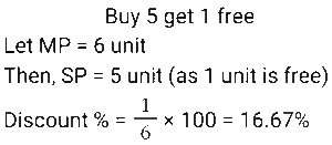 Discount (SSC) (Part-2)Total Questions: 5011. A trader offers the following discount schemes on the purchase of a refrigerator. [SSC CGL 23/09/2024 (1st Shift)](i) a discount of 10% followed by a discount of 8% (ii) successive discounts of 12% and 10% (iii) two successive discounts of 12% (iv) a discount of 20% In which scheme is the selling price the lowest?(a) (iv)(b) (i)(c) (ii)(d) (iii)Correct Answer: (d) (iii)Solution:12. An article is sold for₹747 after successive discounts of 17% and x%. If the marked price of the article is₹1,600, what is the value of x ? [SSC CGL 24/09/2024 (2nd Shift)](a) 32.26(b) 43.75(c) 22.12(d) 40.28Correct Answer: (b) 43.75Solution:13. During a new-year sale, a shopkeeper offers a discount scheme to his customers, 'Buy 5 Sweaters, Get 2 Sweaters Free'. Find the effective percentage discount given by the shopkeeper. [SSC CGL 25/09/2024 (2nd Shift)](a) 28 ⁴⁄₇ %(b) 25%(c) 22 ²⁄₉ %(d) 30%Correct Answer: (a) 28 ⁴⁄₇ %Solution:14. Two successive percentage decrease of 25% each is by what percentage less than two successive percentage increase of 25% each ? (Round to two decimal places.) [SSC CGL 26/09/2024 (1st Shift)](a) 50%(b) 43.75%(c) 22.22%(d) 56.25%Correct Answer: (c) 22.22%Solution:15. A person first increases the price of a commodity by 8% and then he announces a discount of 18%. The actual discount (in%) on the original price is: [SSC CGL 26/09/2024 (1st Shift)](a) 11.44(b) 14.44(c) 9.44(d) 8.44Correct Answer: (a) 11.44Solution:16. A shopkeeper decides to raise the marked price of an article by 40%. How much percentage discount should he allow to be able to sell the article at the original marked price? [SSC CHSL 01/07/2024 (1st Shift)](a) 28 ⁴⁄₇ %(b) 31 ²⁄₇ %(c) 24 ³⁄₇ %(d) 26 ³⁄₇ %Correct Answer: (a) 28 ⁴⁄₇ %Solution:17. One company is offering a 25% discount on a particular product. Anurag visited a store. He was trying to find a deal that would allow him to save at least 390. How many minimum items should he purchase if each item costs ₹340? [SSC CHSL 01/07/2024 (4th Shift)](a) 4(b) 7(c) 6(d) 5Correct Answer: (d) 5Solution:18. A dozen pairs of gloves of ₹180 are available at a discount of 10%. How many pairs of gloves can be bought for ₹54? [SSC CHSL 02/07/2024 (1st Shift)](a) 2(b) 8(c) 6(d) 4Correct Answer: (d) 4Solution:19. What is the effective discount percentage if a shopkeeper offers a scheme discount 'buy five and get one free'? [SSC CHSL 02/07/2024 (2nd Shift)](a) 15.67%(b) 16.33%(c) 15.33%(d) 16.67%Correct Answer: (d) 16.67%Solution:20. Two offers were being made to Swaroop for a watch with a marked price of ₹1,600. Either two successive discounts of 20%, or two discounts of 30% and 10% after each other is offered. If Swaroop opted for the better plan over the other, how much more must he have saved? [SSC CHSL 02/07/2024 (4th Shift)](a) ₹22(b) ₹35(c) ₹16(d) ₹30Correct Answer: (c) ₹16Solution:Submit Quiz« Previous12345Next »