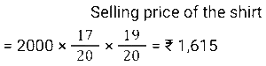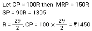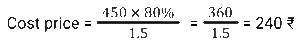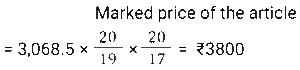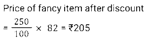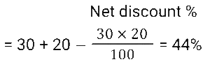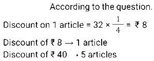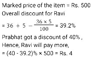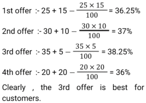 Discount (SSC) (Part-3)Total Questions: 5021. The company offers the following four types of successive discounts on a computer which is listed at ₹6,000. [SSC CHSL 08/08/2023 (1st Shift)]i) 25% and 15% ii) 30% and 10% iii) 35% and 5% iv) 20% and 20% Which of these offers is best for a customer(a) Fourth offer(b) First offer(c) Third offer(d) Second offerCorrect Answer: (c) Third offerSolution:22. An article is marked at ₹450. If it is sold at a discount of 20%, then the selling price becomes 1.5 times of its cost price. What is the cost price (in ₹)? [SSC CHSL 08/08/2023 (3rd Shift)](a) 360(b) 240(c) 330(d) 270Correct Answer: (b) 240Solution:23. Lakshita purchased a sofa set at a discount of 25%. As per her calculations, she noticed that if she would have not been given this discount, she would have paid ₹22,400 more as the cost of this sofa set. How much did Lakshita pay for the sofa set? [SSC CHSL 10/08/2023 (2nd Shift)](a) ₹22,400(b) ₹33,600(c) ₹ 67,200(d) ₹67,000Correct Answer: (c) ₹ 67,200Solution:24. Rohita offers a discount of 20% on the marked price of an object. Due to recession of market, she further offers a discount of 30% on its sale. What is the equivalent single discount percentage corresponding to these two successive discounts offers ? [SSC CHSL 11/08/2023 (1st Shift)](a) 42%(b) 56%(c) 40%(d) 44%Correct Answer: (d) 44%Solution:25. On an item having a marked price of ₹500, Ravi was offered successive discounts of 36% and 5%, respectively, while Prabhat was offered a single discount of 40%. Who paid more for the item and by how much? [SSC CHSL 11/08/2023 (4th Shift)](a) Ravi, ₹4(b) Prabhat, ₹5(c) Ravi, ₹5(d) Prabhat, ₹4Correct Answer: (a) Ravi, ₹4Solution:26. A shopkeeper has announced a 25% rebate on the prices of stationery items. If anyone needs to have a rebate of ₹40, then how many stationery items each costing ₹32 should be purchased? [SSC CHSL 14/08/2023 (1st Shift)](a) 5 items(b) 6 items(c) 4 items(d) 3 itemsCorrect Answer: (a) 5 itemsSolution:27. The marked price on a fancy item is ₹250 but there is an 18% discount during festival season. The price of the fancy item after discount is: [SSC CHSL 14/08/2023 (2nd Shift)](a) ₹204(b) ₹205(c) ₹202(d) ₹208Correct Answer: (b) ₹205Solution:28. The marked price of a shirt is 2,000. It is sold at a discount of 15%. The shopkeeper has allowed a further discount of 5% due to the off season. Find the selling price of the shirt. [SSC CHSL 14/08/2023 (3rd Shift)](a) ₹1,710(b) ₹1,615(c) ₹1,650(d) ₹1,700Correct Answer: (b) ₹1,615Solution:29. A man offers a 40% discount on an item which has been marked 50% above the cost price. If the selling price of the item is ₹1,305, then the cost price is: [SSC CHSL 17/08/2023 (1st Shift)](a) ₹1,360(b) ₹1,450(c) ₹1,680(d) ₹1,560Correct Answer: (b) ₹1,450Solution:30. A shopkeeper gives an additional concession of 5% on an item which is already discounted by 15% on the marked price. If the buyer pays 3,068.5 for the item, then find the marked price. [SSC CHSL 17/08/2023 (2nd Shift)](a) ₹3,500(b) ₹3,700(c) ₹3800(d) ₹3780Correct Answer: (c) ₹3800Solution:Submit Quiz« Previous12345Next »