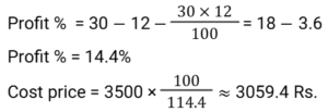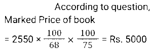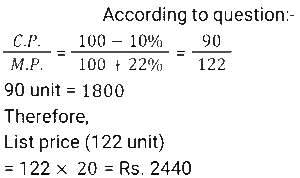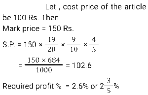 Discount (SSC) (Part-4)Total Questions: 501. In a sale, a shop is giving a discount as per the following scheme: 10% discount on clothes, 12% on groceries, 15% on stationery and 20% on footwear. Anjali bought a packet of tea, a notebook and bathroom sleepers whose marked prices are ₹450, ₹100 and ₹850, respectively. How much amount (in ₹) does she have to pay? [Graduate Level 28/06/2023 (Shift-3)](a) 1116(b) 1261(c) 1161(d) 1471Correct Answer: (c) 1161Solution:2. A silver puja thali set marked at ₹10,000 is sold with two successive discounts of 10% and 5%. An additional 5% discount is offered if the payment is made in cash mode. Find the selling price of the article on cash payment. [Higher Secondary 27/06/2023 (Shift-3)](a) ₹8,212.50(b) ₹8,122.50(c) ₹8,100.50(d) ₹8,200.50Correct Answer: (b) ₹8,122.50Solution:3. The marked price of a commodity was given as ₹y per kg. After two successive discounts of 8% and 12.5%, respectively, the retailer purchased it for ₹3,059 per kg. What was the value of y ? [Higher Secondary 28/06/2023 (Shift-2)](a) 3840(b) 3800(c) 3900(d) 3750Correct Answer: (b) 3800Solution:4. A shopkeeper keeps the marked price of his goods 50% more than the cost price. If he gives successive discounts of 5%, 10% and 20% on marked price, then what is his profit percentage? [Higher Secondary 28/06/2023 (Shift-2)](a) 2 ⅗%(b) 1 ⅗%(c) 1 ⅖%(d) 2 ⅕%Correct Answer: (a) 2 ⅗%Solution:5. A purchases a merchant smartwatch for ₹1,800 and fixes its list price in such a way that, after allowing a discount of 10%, he earns a profit of 22%. The list price of the smartwatch (in ₹) is: [Higher Secondary 30/06/2023 (Shift-2)](a) 2440(b) 2450(c) 2520(d) 2180Correct Answer: (a) 2440Solution:6. Somesh is a shopkeeper who gives two successive discounts on an umbrella marked ₹560. The first discount given is 17%. If the customer Mahesh pays ₹420 for the umbrella, then find the second discount given (correct to two places of decimals). [Matriculation Level 27/06/2023 (Shift-1)](a) 4.69%(b) 9.64%(c) 6.49%(d) 6.94%Correct Answer: (b) 9.64%Solution:7. A store declares a discount scheme as "Buy 1 shampoo bottle and get 60% off on another shampoo of same quality, size and of the same price." What is the profit percentage of the store, if each shampoo bottle has the cost price 60% below the marked price? [Matriculation Level 27/06/2023 (Shift-2)](a) 60%(b) 64%(c) 75%(d) 54%Correct Answer: (c) 75%Solution:8. A book is sold at a discount of 32% and an additional discount of 25% is allowed on cash payment. If Ramesh purchased the book by paying Rs.2,550 in cash, find the marked price of the book. [Matriculation Level 28/06/2023 (Shift-1)](a) Rs.5,000(b) Rs.5,050(c) Rs.4,950(d) Rs.5,560Correct Answer: (a) Rs.5,000Solution:9. Rajesh marks his goods 30% above the cost price but allows a 12% discount for cash payment. If he sells the goods for ₹3,500, find his cost price (up to one place of decimal). [Matriculation Level 28/06/2023 (Shift-4)](a) ₹3,090.5(b) ₹3,095.9(c) ₹3,054.9(d) ₹3,059.4Correct Answer: (d) ₹3,059.4Solution:10. If a watch that is marked at ₹1,800 is being sold for ₹1,250, then the discount percentage at which the watch is being sold is: [Matriculation Level 30/06/2023 (Shift-3)](a) 30 ⁵⁄₉%(b) 28 ²⁄₉%(c) 31 ⅗%(d) 32 ⁵⁄₉%Correct Answer: (a) 30 ⁵⁄₉%Solution:Submit Quiz12345Next »
