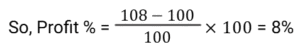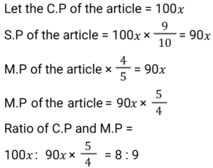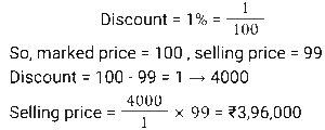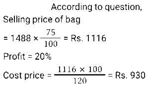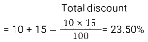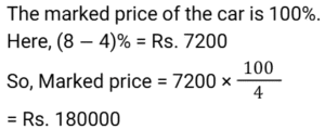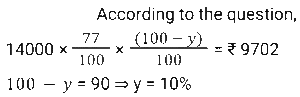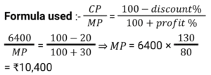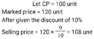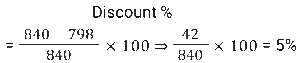 Discount (SSC) (Part-4)Total Questions: 5011. Marked price of a computer is Rs. 10000. Selling price of computer is Rs. 7650. If two successive discounts of 15 percent and x percent are given, then what is the value of x ? [SSC MTS 02/05/2023 (Morning)](a) 5%(b) 15%(c) 10%(d) 20%Correct Answer: (c) 10%Solution:12. A product, whose marked price is Rs. 840, is sold for Rs. 798 by a wholesale shop. What is the percentage discount given by him? [SSC MTS 03/05/2023 (Evening)](a) 6%(b) 5%(c) 3%(d) 4%Correct Answer: (b) 5%Solution:13. Marked price of a computer is Rs. 14000. Selling price of the computer is Rs. 9702. If two successive discounts of 23 percent and y percent are given, then what is the value of y ? [SSC MTS 04/05/2023 (Afternoon)](a) 15%(b) 10%(c) 12%(d) 5%Correct Answer: (b) 10%Solution:14. On a deal, the car dealer allowed 1% discount to a customer. If the discount allowed was Rs. 4000, then what is the selling price of the car ? [SSC MTS 04/05/2023 (Evening)](a) Rs.388500(b) Rs.380500(c) Rs.395600(d) Rs.396000Correct Answer: (d) Rs.396000Solution:15. A water purifier is on sale for 10% discount on the original price. A store-wide sale results in an additional discount of 15%. What is the total discount on the original price? [SSC MTS 08/05/2023 (Morning)](a) 18.50%(b) 19.50%(c) 22.50%(d) 23.50%Correct Answer: (d) 23.50%Solution:16. A shopkeeper sells an article at 10 percent loss after giving a discount of 20 percent. What is the ratio of cost price and marked price of the article? [SSC MTS 10/05/2023 (Morning)](a) 5 : 8(b) 8 : 9(c) 7 : 9(d) 4 : 9Correct Answer: (b) 8 : 9Solution:17. The marked price of an article is 20 percent more than its cost price. If 10 percent discount is given on the marked price, then what will be the profit percentage? [SSC MTS 11/05/2023 (Morning)](a) 8%(b) 15%(c) 12%(d) 10%Correct Answer: (a) 8%Solution:18. A dealer purchased a washing machine for Rs. 6400. After allowing a discount of 20% on its marked price, he still gains 30%. Find the marked price of the washing machine. [SSC MTS 15/05/2023 (Evening)](a) Rs.12,000(b) Rs.10,400(c) Rs.11,000(d) Rs.13,000Correct Answer: (b) Rs.10,400Solution:19. A trader allowed a discount of 25 percent on a trolley bag having list price of Rs. 1488 and earns a profit of 20 percent. What is the cost price of the trolley bag? [SSC MTS 16/05/2023 (Morning)](a) Rs.908(b) Rs.880(c) Rs.930(d) Rs.960Correct Answer: (c) Rs.930Solution:20. On selling a car, a person gives a discount of 8 percent. If he gives a discount of 4 percent, then he receives Rs. 7200 more than in the case of 8 percent discount. What is the marked price of car? [SSC MTS 19/05/2023 (Morning)](a) Rs.150000(b) Rs.160000(c) Rs.180000(d) Rs.110000Correct Answer: (c) Rs.180000Solution:Submit Quiz« Previous12345Next »