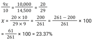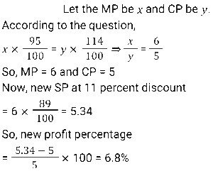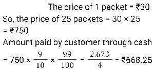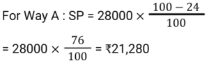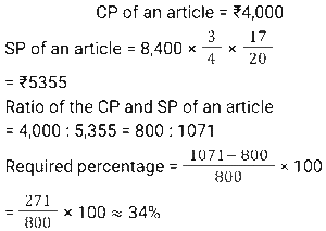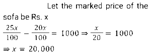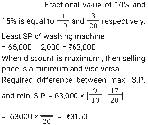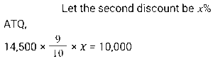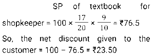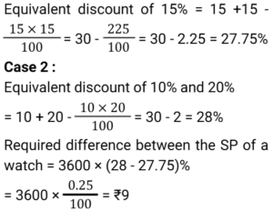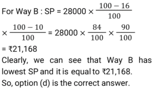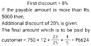 Discount (SSC) (Part-4)Total Questions: 5041. A grocery shop is offering 10% discount on the purchase of Rs.500 and above. A 5% discount is given on the purchase of value above Rs.250 but below Rs.500. A discount of additional 1% is given if payment is made instantly in cash. How much would a customer have to pay by cash if he buys 25 packets of biscuits and one packet is priced at Rs.30? [SSC CGL 09/12/2022 (4th Shift)](a) Rs.670.25(b) Rs.668.25(c) Rs.675(d) Rs.667.05Correct Answer: (b) Rs.668.25Solution:42. The printed price of a TV set is ₹14,500. It is sold for ₹10,000 with two consecutive discounts. if the first discount is 10%, then what is the second discount? [SSC CGL 12/12/2022 (2nd Shift)](a) 23.37%(b) 25.37%(c) 20.37%(d) 27.37%Correct Answer: (a) 23.37%Solution:43. An article costs Rs.4,000 to a shopkeeper, who marks its price at Rs.8,400. The shopkeeper sells it to a customer at a discount of 25%. The customer gets a further discount of 15% on the discounted price if the customer redeems a coupon issued by the store previously. What is the profit percentage (to the nearest integer) earned by the shopkeeper in this transaction? [SSC CGL 13/12/2022 (1st Shift)](a) 34%(b) 51%(c) 42%(d) 36%Correct Answer: (a) 34%Solution:44. A shopkeeper allows a discount of 15% on a textbook with the marked price Rs.100. On request, he further allows a discount of 10% on the new price of the goods. What is the overall discount given to the customer? [SSC CPO 09/11/2022 (Afternoon)](a) Rs.23.50(b) Rs.75.00(c) Rs.25.00(d) Rs.76.50Correct Answer: (a) Rs.23.50Solution:45. In a shop, a discount of 8% is provided. If the total payable amount after discount is more than ₹5,000, an additional discount of 20% is provided, then determine the final amount to be paid by customer, if he buys 12 products each of price ₹750 [SSC CPO 09/11/2022 (Evening)](a) ₹6,724(b) ₹6,624(c) ₹6,424(d) ₹6,524Correct Answer: (b) ₹6,624Solution:46. In a showroom the price of a washing machine is ₹65,000. The customer gets a cash discount of ₹2,000, and gets a scratch card promising a percentage discount of 10% to 15%. Determine the difference between the least and the maximum selling prices of the washing machine. [SSC CPO 10/11/2022 (Morning)](a) ₹3,150(b) ₹3,570(c) ₹3,200(d) ₹3,650Correct Answer: (a) ₹3,150Solution:47. Elizabeth went to a furniture store and purchased a study table. She received a 20% discount on it. She would have saved Rs.1,000 more if she had received a 25% discount. What was the marked price of the study table ? [SSC CPO 11/11/2022 (Evening)](a) Rs.21,100(b) Rs.20,000(c) Rs.18,900(d) Rs.19,200Correct Answer: (b) Rs.20,000Solution:48. When an article is sold at 5 percent discount, then there is a profit of 14 percent. If the discount is 11 percent, then what will be the profit ? [SSC CGL Tier II (08/08/2022)](a) 7.6%(b) 8.4%(c) 7.2%(d) 6.8%Correct Answer: (d) 6.8%Solution:49. Marked price of an article is ₹28000. It can be sold at one of the following ways: Way A: A single discount of 24 percent. Way B: Two successive discounts of 16 percent and 10 percent. Which way will have lowest selling price and what will be the value of it ? [SSC CGL Tier II (08/08/2022)](a) Way A, ₹21168(b) Way B, ₹21280(c) Way A, ₹21280(d) Way B, ₹21168Correct Answer: (d) Way B, ₹21168Solution:50. A shopkeeper offers the following two discount schemes on the sale of a watch having marked price ₹3,600. [Graduate Level 04/08/2022 (Shift-2)](1) Two successive discounts of 15%. (2) A discount of 10% followed by a discount of 20%. What is the difference between the selling price of the watch in case (1) and case (2)?(a) ₹8(b) ₹9(c) ₹10(d) ₹11Correct Answer: (b) ₹9Solution:Submit Quiz« Previous12345