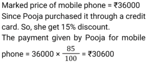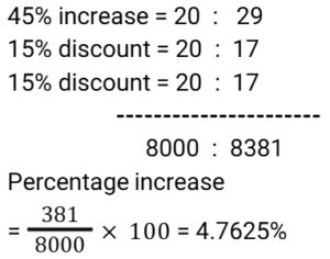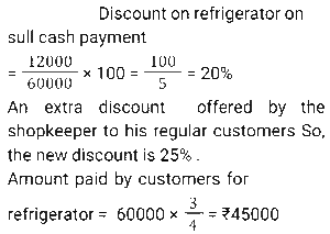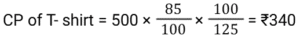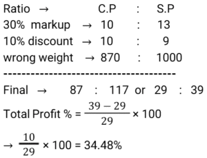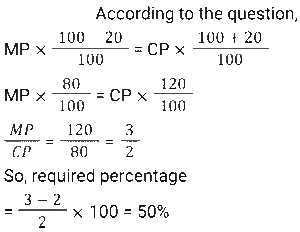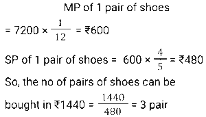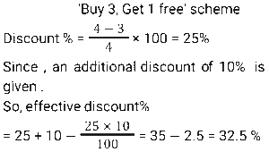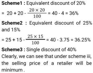 Discount (SSC) (Part-5)Total Questions: 611. A retailer offers the following discount schemes for buyers on an item. [Graduate Level 05/08/2022 (Shift-3)]i) Two successive discount of 20%. ii) A discount of 25% followed by a discount of 15%. iii) A discount of 40%. Under which scheme(s) will the selling price be minimum?(a) iii(b) ii(c) i and ii(d) iCorrect Answer: (a) iiiSolution:2. The marked price of every item being sold by a wholesaler was ₹300. The wholesaler was offering a stock-clearance sale under which, for every three items paid for, one item was being given free. In addition to this, a further 10% discount on the amount payable on the 'Buy 3, Get 1 free' scheme price was being offered to anyone making purchases worth more than ₹10,000. Ramesh made purchases for which this amount payable was ₹18,000. What was the effective percentage discount that was offered to Ramesh during this transaction? [SSC CHSL 24/05/2022 (Morning)](a) 32%(b) 31.5%(c) 32.5%(d) 32.75%Correct Answer: (c) 32.5%Solution:3. A shopkeeper marks up his goods by 30% and then gives a discount of 10% on the marked price. Apart from this, he uses a faulty balance which reads 1 kg for 870 g. What is his net profit percentage ? [SSC CHSL 24/05/2022 (Afternoon)](a) 38.42%(b) 34.84%(c) 34.48%(d) 38.24%Correct Answer: (c) 34.48%Solution:4. The price of an article is raised by 45% and then two successive discounts of 15% each are allowed. Ultimately the price of the article is________ . [SSC CHSL 26/05/2022 (Morning)](a) decreased by 7.7625%(b) increased by 4.7625%(c) decreased by 4.7625%(d) increased by 7.7625%Correct Answer: (b) increased by 4.7625%Solution:5. The marked price of a mobile phone is ₹36,000. A shopkeeper gives a discount of 11% on the marked price. Further, if a customer purchases it through credit card the discount increases by 15%. Pooja purchases it through the credit card. How much does she pay? [SSC CHSL 27/05/2022 (Morning)](a) ₹31,000(b) ₹32,000(c) ₹30,880(d) ₹30,600Correct Answer: (d) ₹30,600Solution:6. Anil offers his customer a discount of 15% on a T-shirt and he still makes a profit of 25%. What is the actual cost of the T-shirt marked ₹500? [SSC CHSL 30/05/2022 (Morning)](a) ₹340(b) ₹330(c) ₹350(d) ₹360Correct Answer: (a) ₹340Solution:7. A shopkeeper wanted to sell ₹3,000 worth of products. He gave two options - giving three successive discounts of 10% each, or giving a single discount of 30%. If a buyer chooses the former option how much extra/less does he pay as compared to the second option [SSC CHSL 30/05/2022 (Afternoon)](a) ₹87 less(b) ₹60 extra(c) ₹87 extra(d) ₹60 lessCorrect Answer: (c) ₹87 extraSolution:8. If a company gives a discount of 20% on the marked price of an article and gains 20% on that particular article, then at what percentage above the cost price did the company mark its goods ? [SSC CHSL 30/05/2022 (Afternoon)](a) 50%(b) 20%(c) 40%(d) 25%Correct Answer: (a) 50%Solution:9. The marked price of a refrigerator is ₹60,000. A shopkeeper offers a flat discount of ₹12,000 on full cash payment. Further he offers an extra discount of 5% on the marked price to his regular customers. How much does a regular customer have to pay for the refrigerator ? [SSC CHSL 31/05/2022 (Morning)](a) ₹45,000(b) ₹48,000(c) ₹44,000(d) ₹47,000Correct Answer: (a) ₹45,000Solution:10. There is a 20% discount on a dozen pairs of shoes marked at ₹7,200. How many pairs of shoes can be bought with ₹1,440? [SSC CHSL 31/05/2022 (Evening)](a) 3(b) 5(c) 2(d) 4Correct Answer: (a) 3Solution:Submit Quiz1234567Next »