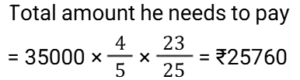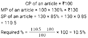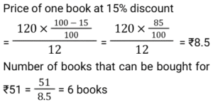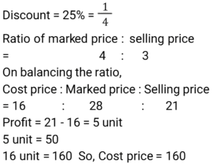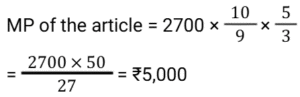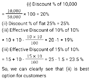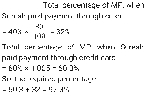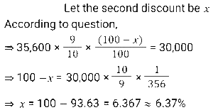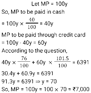Discount (SSC) (Part-5)Total Questions: 6111. The marked price of a mobile phone was ₹35,600. The shop owner offered a 10% trade discount on the marked price but on further request by the customer, he sold the phone for ₹30,000 after giving a cash discount. How much is this cash discount as a percentage of the price after the trade discount? (Give your answer correct to 2 decimal places.) [SSC CHSL 01/06/2022 (Morning)](a) 6.37%(b) 5.75%(c) 4.95%(d) 5.25%Correct Answer: (a) 6.37%Solution:12. Under a sale offer for an item, Mahesh was offered 24% discount on the part of the marked price that was paid in cash, but was charged 1.5% on the part of the marked price paid through a credit card. If Mahesh paid 40% of the marked price in cash and the rest through a credit card and his total final payment was ₹6,391, what was the marked price of the item? [SSC CHSL 01/06/2022 (Afternoon)](a) ₹7,200(b) ₹6,900(c) ₹7,050(d) ₹7,000Correct Answer: (d) ₹7,000Solution:13. An article is sold at a discount of 10% and an additional discount of 40% is allowed on cash payment. If Anita purchased an article by paying ₹2,700 in cash, the marked price of the article was: [SSC CHSL 02/06/2022 (Afternoon)](a) ₹5,000(b) ₹2,500(c) ₹2,000(d) ₹5,500Correct Answer: (a) ₹5,000Solution:14. The marked price of a laptop is Rs. 50,000. A shopkeeper gives the following four schemes of discount to his customers. Which one is more beneficial to the customers? [SSC CHSL 03/06/2022 (Morning)](a) i(b) iv(c) ii(d) iiiCorrect Answer: (c) iiSolution:15. A man offers a 21% discount on an item. He offers a further discount of 40% on the reduced price for the first 100 customers. If the selling price of the item is ₹4,740, and the customer is one of the first 100 then the marked price (in ₹) of the item is [SSC CHSL 03/06/2022 (Afternoon)](a) 10,000(b) 8,000(c) 12,000(d) 9,000Correct Answer: (a) 10,000Solution:16. The marked price of an article is 30% more than the cost price. A discount of 15% is offered on the marked price. By what percentage is the final price more than the cost price? [SSC CHSL 07/06/2022 (Morning)](a) 10.5%(b) 15.5%(c) 19.5%(d) 8.5%Correct Answer: (a) 10.5%Solution:17. When payment is made online, the discount offered is 20%. Additional discount of 8% is given to ABC credit card holders. Sandeep buys a laptop of ₹35,000 by paying online and pays through his ABC credit card. How much does he need to pay? [SSC CHSL 07/06/2022 (Morning)](a) ₹25,750(b) ₹25,760(c) ₹25,770(d) ₹25,740Correct Answer: (b) ₹25,760Solution:18. Under a sale offer, Suresh was offered a 20% discount on the part of the marked price that was paid in cash, but was charged 0.5% on the part of the marked price paid through a credit card. If Suresh paid 40% of the marked price in cash and the rest through a credit card, what percentage of the marked price was his total final payment? [SSC CHSL 07/06/2022 (Evening)](a) 93.2%(b) 92.6%(c) 92.8%(d) 92.3%Correct Answer: (d) 92.3%Solution:19. The ratio of the cost price to the marked price of an article is 4 : 7. A discount of 25% is given on the marked price and the shopkeeper made a profit of ₹50. Find the cost price of the article. [SSC CHSL 08/06/2022 (Afternoon)](a) ₹160(b) ₹165(c) ₹150(d) ₹155Correct Answer: (a) ₹160Solution:20. One dozen books quoted at 120 are available at 15% discount. How many books can be bought for ₹51? [SSC CHSL 09/06/2022 (Morning)](a) 8(b) 5(c) 6(d) 7Correct Answer: (c) 6Solution:Submit Quiz« Previous1234567Next »