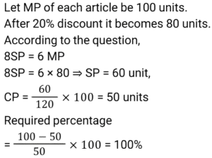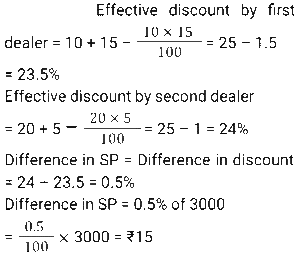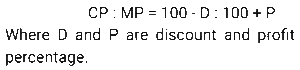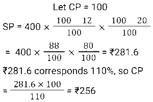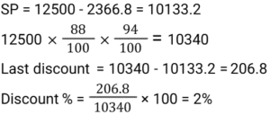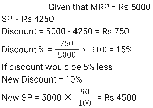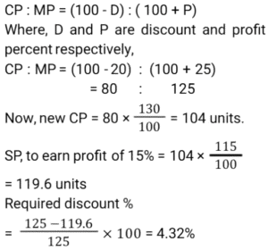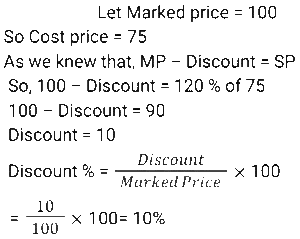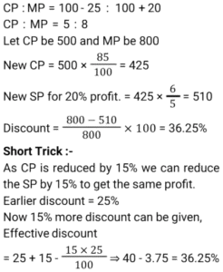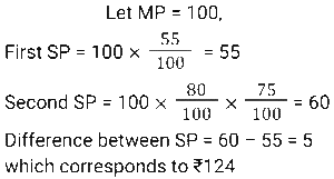 Discount (SSC) (Part-5)Total Questions: 6131. A discount of 10% is offered on the price of an article if the payment is made online. An additional discount of 5% is given to credit card holders. A person wishes to buy a watch priced at ₹60,000 by paying online through credit card. How much does he need to pay (in ₹)? [SSC CGL Tier II (29/01/2022)](a) 51,300(b) 62,150(c) 61,250(d) 53,100Correct Answer: (a) 51,300Solution:32. A trader gains 25% by selling an article with 20% discount on its marked price. If the cost price of the article increases by 30%, then how much discount (in %) should he offer on the same marked price to gain 15% of profit? [SSC CGL Tier II (29/01/2022)](a) 4.87%(b) 5.08%(c) 5.12%(d) 4.32%Correct Answer: (d) 4.32%Solution:33. A dealer gains 20% by selling an article at 25% discount on its marked price. If the cost price of the article is decreased by 15%, how much discount percentage should he now give on the same marked price so as to earn the same percentage of profit as before? [SSC CGL Tier II (03/02/2022)](a) 32.50%(b) 35%(c) 36.25%(d) 37.75%Correct Answer: (c) 36.25%Solution:34. A dealer offers a cash discount of 20% and still makes a profit of 20%. If he further sells 8 articles at a rate of 6 articles, then how much percentage above the cost price does he mark on each article? [SSC CGL Tier II (03/02/2022)](a) 77.5%(b) 100%(c) 112.5%(d) 87.5%Correct Answer: (b) 100%Solution:35. The marked price of an article is ₹400. A shopkeeper sells it by giving two successive discounts of 12% and 20% on its marked price. If he earns a profit of 10%, then the cost of the article is: [SSC MTS 05/10/2021 (Morning)](a) ₹250(b) ₹260(c) ₹256(d) ₹268Correct Answer: (c) ₹256Solution:36. Two dealers offer an item at the same marked price ₹3,000. The first dealer allows successive discounts of 10% and 15%. The other dealer allows successive discounts of 20% and 5%. Find the difference in the selling price of the item under the two offers. [SSC MTS 11/10/2021 (Morning)](a) ₹15(b) ₹20(c) ₹10(d) ₹25Correct Answer: (a) ₹15Solution:37. An article was subject to three successive discounts, whereby a customer had to pay ₹2,366.8 less than the marked price of ₹12,500. If the rates of the first two discounts were, respectively, 12% and 6%, then what was the rate percentage of the third discount? [SSC MTS 12/10/2021 (Afternoon)](a) 3.6(b) 2(c) 2.5(d) 3Correct Answer: (b) 2Solution:38. On the marked price of an article, the difference between the two selling prices, One with a single discount of 45% and the other with two Successive discounts of 20% and 25%, is ₹124. What is the marked price (in ₹) of the article? [SSC MTS 14/10/2021 (Afternoon)](a) 2,540(b) 2,480(c) 2,520(d) 2,500Correct Answer: (b) 2,480Solution:39. In festival seasons, A gadget which is marked at rs 5,000 is sold at rs 4250 after a discount. If the discount percentage is decreased by 5%, then at which price will a customer buy it ? [SSC MTS 20/10/2021 (Morning)](a) 5,000(b) 4,000(c) 4,750(d) 4,500Correct Answer: (d) 4,500Solution:40. A bookseller buys books at a discount of 25% on the marked price. How much percent discount should he offer so as to gain 20% on the sale ? [SSC MTS 27/10/2021 (Morning)](a) 25%(b) 20%(c) 30%(d) 10%Correct Answer: (d) 10%Solution:Submit Quiz« Previous1234567Next »