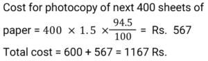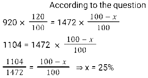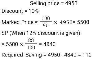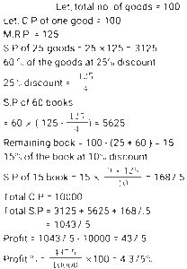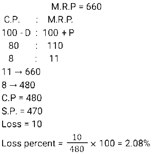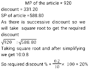 Discount (SSC) (Part-5)Total Questions: 6151. A shopkeeper marks an article at a price such that after giving a discount of x% he gains 20%. If the cost price and the marked price of the article are ₹920 and ₹1472 respectively, then what is the value of x ? [SSC CGL 24/08/2021 (Evening)](a) 18(b) 20(c) 25(d) 30Correct Answer: (c) 25Solution:52. A merchant announces 25% discount on the price of a shirt. If one needs to have a total rebate of 875 and the price of each shirt is 250, then how many shirts should the person purchase? [SSC CHSL 13/04/2021 (Evening)](a) 15(b) 12(c) 9(d) 14Correct Answer: (d) 14Solution:53. At a factory outlet of a footwear company, every item is available at a discount of 10%. Charu selected footwear marked for Rs. 900. While paying the bill, it was found that the footwear was slightly damaged for which she got another discount of 10%. How much did she pay for the footwear? [SSC CHSL 16/04/2021 (Evening)](a) 729(b) 801(c) 810(d) 720Correct Answer: (a) 729Solution:54. A shopkeeper charges ₹1.50 to photocopy a sheet of paper and a discount of 5.5% is given on all photocopies done after 400 sheets. How much will it cost to photocopy 800 sheets of paper? [SSC CHSL 19/4/2021 (Evening)](a) ₹1,167(b) ₹1,160(c) ₹1,276(d) ₹1,176Correct Answer: (a) ₹1,167Solution: 55. A customer availed a 10% discount on the purchase of a table and paid Rs.4950 for it. How much money would he have saved if he had bargained to get 12% discount? [SSC CHSL 6/8/2021 (Evening)](a) 110(b) 99(c) 108.90(d) 660Correct Answer: (a) 110Solution:56. The list price of coconut oil is 15% more than its cost price. At what percent less should it be sold for no profit and no loss? [SSC CHSL 9/8/2021 (Evening)](a)(b)(c)(d)Correct Answer: (b)Solution:57. A marks her goods 25% above the cost price. She sells 25% of the goods at the marked price, 60% at 25% discount and the remaining at 10% discount. What is her overall gain or loss percent ? [SSC CHSL 10/8/2021 (Evening)](a) Gain 15.124%(b) Loss 18.175%(c) Loss 3.125%(d) Gain 4.375%Correct Answer: (d) Gain 4.375%Solution:58. The marked price of an article is Rs. 660. A shopkeeper allows a discount of 20% and still gets a profit of 10%. If he sells it for Rs. 470, his profit or loss percent, correct to two decimal place will be: [SSC CHSL11/8/2021 (Morning)](a) Profit 3.06%(b) Loss 5.43%(c) Profit 7.59%(d) Loss 2.08%Correct Answer: (d) Loss 2.08%Solution:59. Two successive discounts, each of x% on the marked price of the article, are equal to a single discount of Rs. 331.20. If the marked price of the article is Rs. 920, then the value of x is: [SSC CPO 23/11/2020 (Morning)](a) 20(b) 18(c) 15(d) 25Correct Answer: (a) 20Solution:60. If house tax is paid before the due date, one gets a reduction of 12% on the amount of the bill. By paying the tax before the due date, a person got a reduction of Rs.2100. The amount (in Rs.) of house tax was: [SSC CPO 23/11/2020 (Evening)](a) 17,500(b) 25,000(c) 21,000(d) 18,000Correct Answer: (a) 17,500Solution:Submit Quiz« Previous1234567Next »