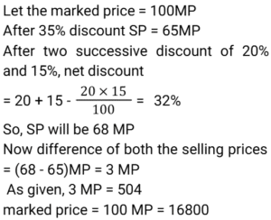 Discount (SSC) (Part-5)Total Questions: 6161. On a marked price, the difference of selling prices with a discount of 35% and two successive discounts of 20% and 15% is Rs.504. The Marked price of the article (in Rs.) is: [SSC CPO 25/11/2020 (Evening)](a) 18,000(b) 16,800(c) 16,000(d) 15,500Correct Answer: (b) 16,800Solution:Submit Quiz« Previous1234567