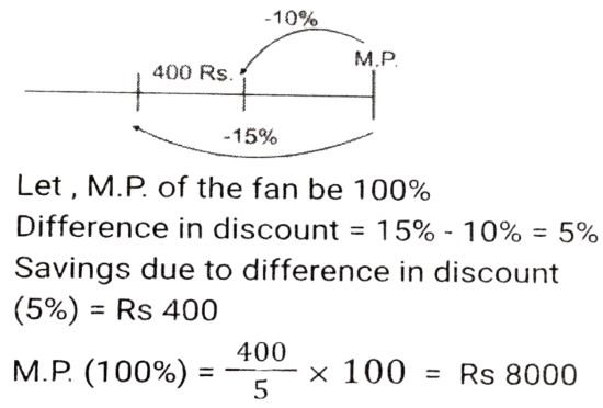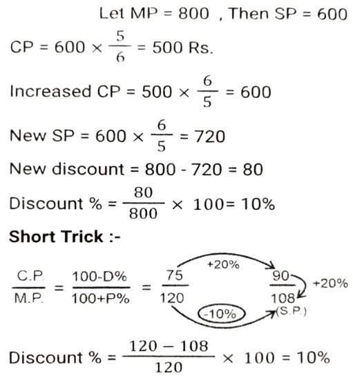 Discount (SSC-Maths)Total Questions: 5021. Sunil purchased a fan at a 10% discount on the labelled price. If he had purchased it at a 15% discount, he would have saved ₹400. Find the labelled price of the fan. [SSC CGL 02/12/2022 (3rd Shift)](a) ₹8,400(b) ₹7,500(c) ₹800(d) ₹8,000Correct Answer: (d) ₹8,000Solution:22. Under a sale offer, Tanvir was offered a 32% discount on the part of the marked price that was paid in cash, but had to add 1.2% on the part of the marked price paid through a credit card. If Tanvir paid 75% of the marked price in cash and the rest through a credit card, what percentage of the marked price was his total final payment? [SSC CHSL 31/05/2022 (Evening)](a) 76.6%(b) 75.9%(c) 76.1%(d) 76.3%Correct Answer: (d) 76.3%Solution:23. The price of a cell phone is ₹20,000. On Sundays, the shopkeeper offers a cash discount of ₹1,000 on the purchase of the cell phone. Further, if someone purchases it through a credit card, he gives 5% additional discount. If someone is purchasing the cell phone on a Sunday through a credit card, then how much does he/she have to pay? [SSC CHSL 27/05/2022 (Afternoon)](a) ₹18,350(b) ₹18,900(c) ₹18,050(d) ₹18,500Correct Answer: (c) ₹18,050Solution:24. An article was marked at x and sold at a discount of (x - 40)%. If the customer paid ₹(x - 32), then find the marked price of the article. [SSC CHSL 14/10/2020 (Evening)](a) 75(b) 60(c) 80(d) 50Correct Answer: (c) 80Solution:25. A dealer allows 25% discount on the marked price of an article and gains 20%. If the cost price of the article increases by 20%, what percent discount should he allow on the marked price so that his profit percentage remains the same? [SSC CPO 13/12/2019 (Evening)](a) 8.5%(b) 10%(c) 12%(d) 7.25%Correct Answer: (b) 10%Solution:26. The marked price of an article is Rs 1500. If two successive discounts, each of x%, on the marked price is equal to a single discount of Rs 587.40, then what will be the selling price of the article if a single discount of x% is given on the marked price? [SSC CGL Tier II (13/09/2019)](a) Rs 1025(b) Rs 1155(c) Rs 1170(d) Rs 1200Correct Answer: (c) Rs 1170Solution:27. A dealer buys an article marked at Rs20000 with two successive discounts of 20% and 5%. He spends Rs1000 for its repair and sells it for Rs 20000. What is his profit/loss percent (correct to two decimal places)? [SSC CHSL 08/07/2019 (Morning)](a) 25.64% profit(b) 23.64% loss(c) 23.46% profit(d) 25.64% lossCorrect Answer: (c) 23.46% profitSolution:28. There was 25% off on shirts. A lady bought that shirt and got an additional 20% discount for paying in cash and further 10% discount for being a loyal customer. She paid Rs 324. What was the price tag (in Rs) on the shirt? [SSC CHSL 05/07/2019 (Afternoon)](a) 650(b) 725(c) 600(d) 750Correct Answer: (c) 600Solution:29. By how much above the cost price should an article be marked up for sale so that after allowing two successive discounts of 20% and 6.25% on it, a net gain of 20% is made on the cost? [SSC CGL 07/06/2019 (Evening)](a) 66 ⅔ %(b) 44 ¼ %(c) 50%(d) 60%Correct Answer: (d) 60%Solution:30. A shopkeeper sells an item for Rs 492 after allowing 18% discount on its marked price. Had he not allowed any discount, he would have earned a profit of 20% on the cost price. What is the cost price of the item ? [SSC CGL 07/06/2019 (Afternoon)](a) Rs 500(b) Rs 640(c) Rs 540(d) Rs 600Correct Answer: (a) Rs 500Solution:Submit Quiz« Previous12345Next »