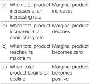 Increasing return to factor, diminishing returns to factor and negative returns to factor. In the third stage, total product falls and marginal product becomes negative. Hence, option (d) is not correctly matehed
