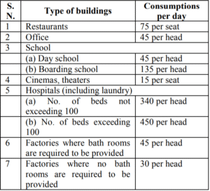 • As per IS : 1172-1963, under normal conditions, the domestic consumption of water in India is about 135 liters/day/capita.