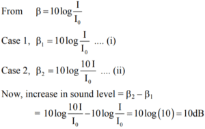 The intensity of sound is increased by 10 times. Let I' be the intensity of previous sound. Intensity of recent sound I' = 10 I