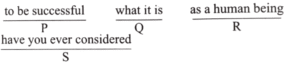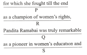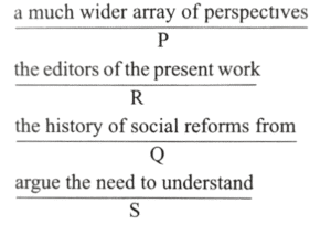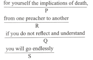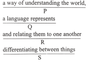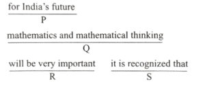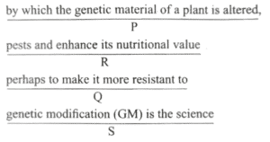 General ability (Part – A : English) Antonyms (NDA/NA SOLVED PAPER 2022-II) (01 to 50)Total Questions: 5021. Each of the following items in this section consists of a sentence, the parts of which have been jumbled. These paris have been labelled P, Q, R and S. Given below each sentence are four sequences namely (a), (b), (c) and (d). You are required to rearrange the jumbled parts of the sentence and mark your response accordingly.question = (21 to 30) (a) SQPR(b) RQPS(c) QRSP(d) PRSQCorrect Answer: (a) SQPRSolution:SQPR, Correct sequence: "Have you ever considered what it is to be successful as a human being"?22. Read the above statement carefully and answer the question below :(a) RPSQ(b) SPRQ(c) RPQS(d) SQPRCorrect Answer: (d) SQPRSolution:SQPR, Correct sequence: "Many people today are willing to surrender to the idea that there is in all instance a single, authoritative truth to be discovered an defended".23. Read the above statement carefully and answer the question below:(a) SRPQ(b) QPSR(c) RSPQ(d) QRSPCorrect Answer: (b) QPSRSolution:QPSR, Correct sequence: "If you do not reflect and understand for yourself the implications of death, you will go endlessly from one preacher to another".24. Read the above statement carefully and answer the question below:(a) PSRQ(b) SRPQ(c) RSPQ(d) QPSRCorrect Answer: (d) QPSRSolution:QPSR, Correct sequence: "A language represents a way of understanding the world, differentiating between the things and relating them to one another".25. Read the above statement carefully and answer the question below :(a) QRPS(b) RPSQ(c) QRSP(d) SQRPCorrect Answer: (d) SQRPSolution:SQRP, Correct sequence: "It is recognized that mathematics and mathematical thinking will be very important for India's future".26. Read the above statement carefully and answer the question below :(a) SRPQ(b) RQPS(c) SPRQ(d) PQRSCorrect Answer: (c) SPRQSolution:SPRQ, Correct sequence: "The preparation of professionals in agriculture and veterinary sciences, through programmes integrated with general education, will be enhanced sharply".27. Read the above statement carefully and answer the question below :(a) RPQS(b) RSPQ(c) SPQR(d) SQPRCorrect Answer: (d) SQPRSolution:SQPR, Correct sequence: "The issues raised by feminists and multiculturalists are certainly very important, and should shift the way we think about politics".28. Read the above statement carefully and answer the question below :(a) QRPS(b) SPRQ(c) RSPQ(d) RPQSCorrect Answer: (b) SPRQSolution:SPRQ, Correct sequence: "Genetic modification(GM) is the science by which the genetic material of a plant is altered, perhaps to make it more resistant to pests and enhance its nutritional value".29. Read the above statement carefully and answer the question below :(a) QSRP(b) QPRS(c) RSPQ(d) RPQSCorrect Answer: (a) QSRPSolution:QSRP,, Correct sequence: "The editors of the present work argue the need to understand the history of social reforms from a much wider array of perspectives"..30. Read the above statement carefully and answer the question below :(a) SRQP(b) QPRS(c) RSQP(d) PQRSCorrect Answer: (c) RSQPSolution:RSQP, Correct sequence: "Pandita Ramabai was truly remarkable as a pioneer in women's education and as a champion of women's rights, for which she fought till the end".Submit Quiz« Previous12345Next »