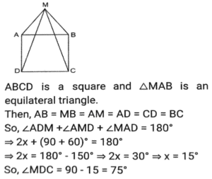 Geometry (Part-10)Total Questions: 5041. In a ∆XYZ, XO is the median and XO = 1/2 YZ. If ∠YXO = 30º, then what is the value of ∠XYZ. [SSC CGL 07/12/2022 (3rd Shift)](a) 15°(b) 90°(c) 30°(d) 60°Correct Answer: (c) 30°Solution:42. The length of the altitude of an equilateral triangle is 6√3 m. The perimeter of the equilateral triangle (in m) is: [SSC CGL 07/12/2022 (3rd Shift)](a) 12√2(b) 36√2(c) 36(d) 24√3Correct Answer: (c) 36Solution:43. ABCD is a square and ∆MAB is an equilateral triangle. MC and MD are joined. What is the degree measure of ∠MDC? [SSC CGL 08/12/2022 (1st Shift)](a) 78°(b) 60°(c) 65°(d) 75°Correct Answer: (d) 75°Solution:44. AB is the diameter of a circle with centre O. If P be a point on the circle such that ∠AOP = 110º then the measure of ∠OBP is: [SSC CGL 08/12/2022 (1st Shift)](a) 50°(b) 65°(c) 60°(d) 55°Correct Answer: (d) 55°Solution:45. In ∆ABC and ∆DEF, ∠A = 55º AB = DE, AC = DF, ∠E = 85º and ∠F = 40º. By which property are ∆ABC and ∆DEF congruent? [SSC CGL 08/12/2022 (2nd Shift)](a) SAS property(b) ASA property(c) RHS property(d) SSS propertyCorrect Answer: (a) SAS propertySolution:46. If two circles do not touch or intersect each other and one does not lie inside the other, then find the number of common tangents. [SSC CGL 08/12/2022 (2nd Shift)](a) 5(b) 4(c) 2(d) 3Correct Answer: (b) 4Solution:47. In the following figure, if / || m, then find the measures of angles marked by 'a' and 'b'. [SSC CGL 08/12/2022 (4th Shift)](a) a = 90º and b = 90º(b) a = 55º and b = 125º(c) a = 70º and b = 110º(d) a = 60º and b = 120ºCorrect Answer: (c) a = 70º and b = 110ºSolution:48. The radius of a circle with centre at O is 6 cm and the central angle of a sector is 40°. Find the area of the sector. [SSC CGL 08/12/2022 (4th Shift)](a) 6π cm²(b) 5π cm²(c) 4π cm²(d) 8π cm²Correct Answer: (c) 4π cm²Solution:49. In triangle ABC, ∠B = 90º and ∠C = 45º. If AC = 2√2 cm, then the length of BC is: [SSC CGL 09/12/2022 (1st Shift)](a) 3(b) 2(c) 1(d) 4Correct Answer: (b) 2Solution:50. In a circle of radius 3 cm, two chords of length 2 cm and 3 cm lie on the same side of a diameter. What is the perpendicular distance between the two chords? [SSC CGL 09/12/2022 (2nd Shift)](a)(b)(c)(d)Correct Answer: (b)Solution:Submit Quiz« Previous12345