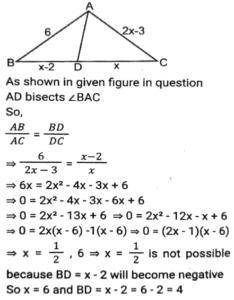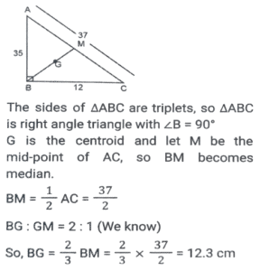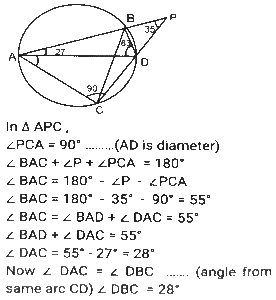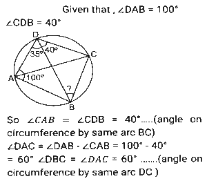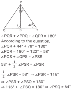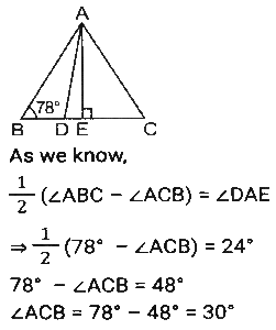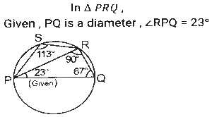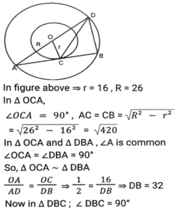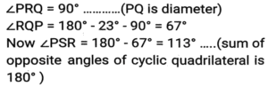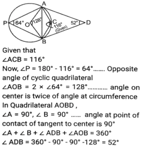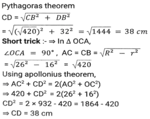 Geometry (Part-12)Total Questions: 5011. AB is a chord in the minor segment of a circle with centre O. C is a point between A and B on the minor arc AB. The tangents of the circle at A and B meet at the point D. If ∠ACB = 116° Then the measure of ∠ADB is: [SSC CGL 20/04/2022 (Afternoon)](a) 64°(b) 48°(c) 56°(d) 52°Correct Answer: (d) 52°Solution:12. PQRS is a cyclic quadrilateral and PQ is a diameter of the circle. If ∠RPQ = 23°, then what is the measure of ∠PSR? [SSC CGL 20/04/2022 (Evening)](a) 113°(b) 157°(c) 147°(d) 123°Correct Answer: (a) 113°Solution:13. A circle is circumscribed on a quadrilateral ABCD, If ∠DAB = 100°, ∠ADB = 35° and ∠CDB = 40°, then find the measure of ∠DBC. [SSC CGL 20/04/2022(Evening)](a) 35°(b) 60°(c) 45°(d) 40°Correct Answer: (b) 60°Solution:14. The radii of two concentric circles with center O are 26 cm and 16 cm. Chord AB of the larger circle is tangent to the smaller circle at C and AD is a diameter. What is the Length of a CD? [SSC CGL 21/04/2022(Morning)](a) 42(b) 36(c) 35(d) 38Correct Answer: (d) 38Solution:15. In ΔABC, the perpendiculars drawn from A, B and C meet the opposite sides at points D,E and F respectively, AD, BE and CF intersect at point P. If ∠EPD = 110° and the bisectors of ∠A and ∠B meet at point Q, then ∠AQB = ? [SSC CGL 21/04/2022 (Afternoon)](a) 115°(b) 110°(c) 135°(d) 125°Correct Answer: (d) 125°Solution:16. In the following figure, AD bisects angle BAC. Find the length (in cm) of BD? [SSC CGL 21/04/2022 (Afternoon)](a) 4(b) 5(c) 9(d) 6Correct Answer: (a) 4Solution:17. AB and CD are two chords in a circle O and AD is the diameter. when produced, AB and CD meet at the point P, If ∠DAP = 27º, ∠APD = 35º then what is the measures (in degrees) of ∠DBC ? [SSC CGL 21/04/2022 (Afternoon)](a) 28(b) 26(c) 30(d) 32Correct Answer: (a) 28Solution:18. In ∆PQR, S is a point on the side QR such that ∠QPS = 1/2 ∠PSR ∠QPR = 78° and ∠PRS = 44º. What is the measure of ∠PSQ ? [SSC CGL Tier II (29/01/2022)](a) 56°(b) 64°(c) 58°(d) 68°Correct Answer: (b) 64°Solution:19. G is the centroid of a triangle ABC, whose sides AB = 35cm, BC = 12 cm, and AC = 37cm. The length of BG (in cm) is (correct to one decimal place): [SSC CGL Tier II (29/01/2022)](a) 12.3(b) 12.9(c) 17.5(d) 11.7Correct Answer: (a) 12.3Solution:20. In ∆ABC, ∠B = 78 deg AD is a bisector of ∠A meeting BC at D, and AE⊥BC at E. If ∠DAE = 24º then the measure of ∠ACB is: [SSC CGL Tier II (29/01/2022)](a) 32°(b) 38°(c) 30°(d) 42°Correct Answer: (c) 30°Solution:Submit Quiz« Previous12345Next »