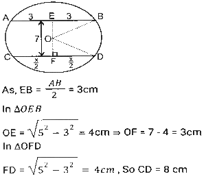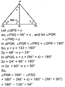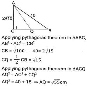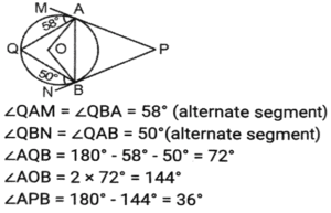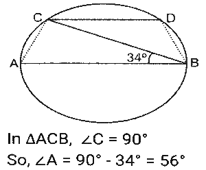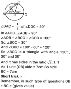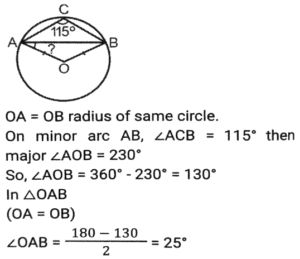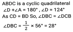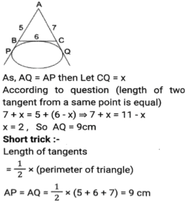 Geometry (Part-12)Total Questions: 5031. In ∆PQR, PQ = PR and S is a point on QR such that ∠PSQ = 96° + ∠QPS and ∠QPR = 132º. What is the measure of ∠PSR? [SSC CGL Tier II (03/02/2022)](a) 45°(b) 56°(c) 54°(d) 52°Correct Answer: (c) 54°Solution:32. In ∆АВС, ∠BAC = 90º, AD is drawn perpendicular from A on BC. Which among the following is the mean proportional between BD and BC? [SSC MTS 05/10/2021 (Morning)](a) AD(b) AB(c) CD(d) ACCorrect Answer: (b) ABSolution:33. In a triangle ABC AB : AC = 5:2 BC = 9 cm. BA is produced to D, and the bisector of the Angle CAD meets BC produced at E. What is the length (in cm) of CE? [SSC CGL 13/08/2021 (Afternoon)](a) 9(b) 10(c) 6(d) 3Correct Answer: (c) 6Solution:34. In a circle with centre O, AD is diameter and AC is chord. Point B is on AC such that OB = 7cm and ∠OBA = 60º. If ∠DOC = 60º, then what is the length of BC (in cm)? [SSC CGL 13/08/2021 (Afternoon)](a) 7(b) 9(c) 5(d) 3.5Correct Answer: (a) 7Solution:35. In ∆ABC, ∠C = 90º and Q is the midpoint of BC. If AB = 10 cm and AC = 2√10 cm, then the length of AQ is: [SSC CGL 13/08/2021 (Evening)](a) √55 cm(b) 5√3 cm(c) 5√2 cm(d) 3√5 cmCorrect Answer: (a) √55 cmSolution:36. In a circle with centre O and radius 5 cm. AB and CD are two parallel chords of lengths 6 cm and x cm, respectively and the chords are on the opposite side of the centre O. The distance between the chords is 7 cm. Find the value of x ? [SSC CGL 16/08/2021 (Morning)](a) 12(b) 8(c) 10(d) 9Correct Answer: (b) 8Solution:37. In a circle with center O, AB is a diameter and CD is a chord such that ∠ABC 34° and CD = BD. What is the measure of ∠DBC? [SSC CGL 16/08/2021 (Morning)](a) 30°(b) 24°(c) 32°(d) 28°Correct Answer: (d) 28°Solution:38. ΔΑΒC is inscribed in a circle with center O, such that ∠ACB = 115°, O is joined to A. What is the measure of ∠OAB? [SSC CGL 16/08/2021 (Evening)](a) 30°(b) 20°(c) 25°(d) 35°Correct Answer: (c) 25°Solution:39. A triangle ABC has sides 5 cm, 6 cm and 7 cm. AB extends touches a circle at P and AC extended touches the same circle at Q. Find the length (in cm) of AQ. [SSC CGL 17/08/2021 (Morning)](a) 13(b) 12(c) 9(d) 11Correct Answer: (c) 9Solution:40. Points A and B are on a circle with center O. PAM and PBN are tangents to the circle at A and B respectively from a point P outside the circle. Point Q is on the major arc AB such that ∠QAM = 58° and QBN = 50°, then find the measure of ∠APB. [SSC CGL 17/08/2021 (Evening)](a) 30°(b) 32°(c) 36°(d) 40°Correct Answer: (c) 36°Solution:Submit Quiz« Previous12345Next »