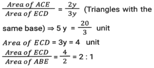 Geometry (Part-12)Total Questions: 5041. In triangle ABC, D is a point on BC such that BD : DC = 3 : 4. E is a point on AD such that AE : ED = 2 : 3. Find the ratio of area (∆ECD): area (ΔΑΕΒ). [SSC CGL 17/08/2021 (Evening)](a) 9 : 8(b) 1 : 2(c) 2 : 1(d) 8 : 9Correct Answer: (c) 2 : 1Solution:42. Point P lies outside a circle with centre O. Tangents PA and PB are drawn to meet the circle at A and B respectively. If ∠APB = 80°, then ∠OAB is equal to: [SSC CGL 18/08/2021 (Morning)](a) 140°(b) 40°(c) 70°(d) 35°Correct Answer: (b) 40°Solution:43. ΔABC~ ΔDEF If the areas of ΔABC and ΔDEF are 100 cm² and 81 cm², respectively and the altitude of ΔDEF is 6.3 cm, then the corresponding altitude (in cm) of ΔABC is: [SSC CGL 18/08/2021 (Morning)](a) 5.6(b) 9(c) 7(d) 8.4Correct Answer: (c) 7Solution:44. ∆ABC is an equilateral triangle. D is a point on side BC such that BD : BC = 1 : 3. If AD = 5√7cm, then the side of the triangle is: [SSC CGL 18/08/2021 (Afternoon)](a) 18cm(b) 12cm(c) 20cm(d) 15cmCorrect Answer: (d) 15cmSolution:45. In a trapezium PQRS, PQ is parallel to RS and diagonal PR and QS intersect at O. PQ = 4 cm, SR = 10cm, then what is area (∆POQ) : area (∆SOR)? [SSC CGL 18/08/2021 (Afternoon)](a) 4 : 25(b) 2 : 3(c) 4 : 9(d) 2 : 5Correct Answer: (a) 4 : 25Solution:46. A chord AB of circle C₁ of radius 17 cm touches circle C₂ which is concentric to C₁. The radius of C₂ is 8 cm. What is the length (in cm) of AB? [SSC CGL 18/08/2021 (Afternoon)](a) 30(b) 25(c) 20(d) 24Correct Answer: (a) 30Solution:47. In a right angled triangle ABC, the lengths of the sides containing the right angle are 5 cm and 12 cm respectively. A circle is inscribed in the triangle ABC. What is the radius of the circle (in cm)? [SSC CGL 18/08/2021 (Evening)](a) 2.8(b) 3(c) 2(d) 2.5Correct Answer: (c) 2Solution:48. Points A and B are on a circle with centre O. Point C is on the major arc АВ. If ∠OAC = 35° and ∠OBC = 45°, then what is the measure (in degrees) of the angle subtended by the minor arc AB at the centre? [SSC CGL 18/08/2021 (Evening)](a) 80(b) 70(c) 100(d) 160Correct Answer: (d) 160Solution:49. Triangle ABC is an equilateral triangle. D and E are points on AB and AC respectively such that DE is parallel to BC and is equal to half the length of BC. If AD + CE + BC = 30 cm, then find the perimeter (in cm) of the quadrilateral BCED. [SSC CGL 20/08/2021 (Morning)](a) 45(b) 25(c) 37.5(d) 35Correct Answer: (c) 37.5Solution:50. The angles of a triangle are in AP (arithmetic progression). If measure of the smallest angle is 50° less than that of the largest angle, then find the largest angle (in degrees) [SSC CGL 20/08/2021 (Afternoon)](a) 80(b) 85(c) 90(d) 75Correct Answer: (b) 85Solution:Submit Quiz« Previous12345
