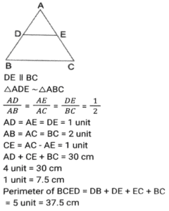 Geometry (Part-12)Total Questions: 5041. In triangle ABC, D is a point on BC such that BD : DC = 3 : 4. E is a point on AD such that AE : ED = 2 : 3. Find the ratio of area (∆ECD): area (ΔΑΕΒ). [SSC CGL 17/08/2021 (Evening)](a) 9 : 8(b) 1 : 2(c) 2 : 1(d) 8 : 9Correct Answer: (c) 2 : 1Solution:42. Point P lies outside a circle with centre O. Tangents PA and PB are drawn to meet the circle at A and B respectively. If ∠APB = 80°, then ∠OAB is equal to: [SSC CGL 18/08/2021 (Morning)](a) 140°(b) 40°(c) 70°(d) 35°Correct Answer: (b) 40°Solution:43. ΔABC~ ΔDEF If the areas of ΔABC and ΔDEF are 100 cm² and 81 cm², respectively and the altitude of ΔDEF is 6.3 cm, then the corresponding altitude (in cm) of ΔABC is: [SSC CGL 18/08/2021 (Morning)](a) 5.6(b) 9(c) 7(d) 8.4Correct Answer: (c) 7Solution:44. ∆ABC is an equilateral triangle. D is a point on side BC such that BD : BC = 1 : 3. If AD = 5√7cm, then the side of the triangle is: [SSC CGL 18/08/2021 (Afternoon)](a) 18cm(b) 12cm(c) 20cm(d) 15cmCorrect Answer: (d) 15cmSolution:45. In a trapezium PQRS, PQ is parallel to RS and diagonal PR and QS intersect at O. PQ = 4 cm, SR = 10cm, then what is area (∆POQ) : area (∆SOR)? [SSC CGL 18/08/2021 (Afternoon)](a) 4 : 25(b) 2 : 3(c) 4 : 9(d) 2 : 5Correct Answer: (a) 4 : 25Solution:46. A chord AB of circle C₁ of radius 17 cm touches circle C₂ which is concentric to C₁. The radius of C₂ is 8 cm. What is the length (in cm) of AB? [SSC CGL 18/08/2021 (Afternoon)](a) 30(b) 25(c) 20(d) 24Correct Answer: (a) 30Solution:47. In a right angled triangle ABC, the lengths of the sides containing the right angle are 5 cm and 12 cm respectively. A circle is inscribed in the triangle ABC. What is the radius of the circle (in cm)? [SSC CGL 18/08/2021 (Evening)](a) 2.8(b) 3(c) 2(d) 2.5Correct Answer: (c) 2Solution:48. Points A and B are on a circle with centre O. Point C is on the major arc АВ. If ∠OAC = 35° and ∠OBC = 45°, then what is the measure (in degrees) of the angle subtended by the minor arc AB at the centre? [SSC CGL 18/08/2021 (Evening)](a) 80(b) 70(c) 100(d) 160Correct Answer: (d) 160Solution:49. Triangle ABC is an equilateral triangle. D and E are points on AB and AC respectively such that DE is parallel to BC and is equal to half the length of BC. If AD + CE + BC = 30 cm, then find the perimeter (in cm) of the quadrilateral BCED. [SSC CGL 20/08/2021 (Morning)](a) 45(b) 25(c) 37.5(d) 35Correct Answer: (c) 37.5Solution:50. The angles of a triangle are in AP (arithmetic progression). If measure of the smallest angle is 50° less than that of the largest angle, then find the largest angle (in degrees) [SSC CGL 20/08/2021 (Afternoon)](a) 80(b) 85(c) 90(d) 75Correct Answer: (b) 85Solution:Submit Quiz« Previous12345