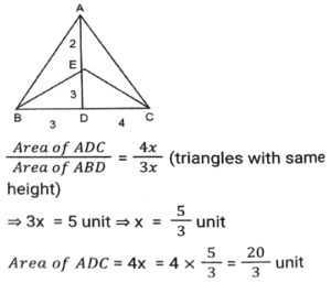 Geometry (Part-12)Total Questions: 5041. In triangle ABC, D is a point on BC such that BD : DC = 3 : 4. E is a point on AD such that AE : ED = 2 : 3. Find the ratio of area (∆ECD): area (ΔΑΕΒ). [SSC CGL 17/08/2021 (Evening)](a) 9 : 8(b) 1 : 2(c) 2 : 1(d) 8 : 9Correct Answer: (c) 2 : 1Solution:42. Point P lies outside a circle with centre O. Tangents PA and PB are drawn to meet the circle at A and B respectively. If ∠APB = 80°, then ∠OAB is equal to: [SSC CGL 18/08/2021 (Morning)](a) 140°(b) 40°(c) 70°(d) 35°Correct Answer: (b) 40°Solution:43. ΔABC~ ΔDEF If the areas of ΔABC and ΔDEF are 100 cm² and 81 cm², respectively and the altitude of ΔDEF is 6.3 cm, then the corresponding altitude (in cm) of ΔABC is: [SSC CGL 18/08/2021 (Morning)](a) 5.6(b) 9(c) 7(d) 8.4Correct Answer: (c) 7Solution:44. ∆ABC is an equilateral triangle. D is a point on side BC such that BD : BC = 1 : 3. If AD = 5√7cm, then the side of the triangle is: [SSC CGL 18/08/2021 (Afternoon)](a) 18cm(b) 12cm(c) 20cm(d) 15cmCorrect Answer: (d) 15cmSolution:45. In a trapezium PQRS, PQ is parallel to RS and diagonal PR and QS intersect at O. PQ = 4 cm, SR = 10cm, then what is area (∆POQ) : area (∆SOR)? [SSC CGL 18/08/2021 (Afternoon)](a) 4 : 25(b) 2 : 3(c) 4 : 9(d) 2 : 5Correct Answer: (a) 4 : 25Solution:46. A chord AB of circle C₁ of radius 17 cm touches circle C₂ which is concentric to C₁. The radius of C₂ is 8 cm. What is the length (in cm) of AB? [SSC CGL 18/08/2021 (Afternoon)](a) 30(b) 25(c) 20(d) 24Correct Answer: (a) 30Solution:47. In a right angled triangle ABC, the lengths of the sides containing the right angle are 5 cm and 12 cm respectively. A circle is inscribed in the triangle ABC. What is the radius of the circle (in cm)? [SSC CGL 18/08/2021 (Evening)](a) 2.8(b) 3(c) 2(d) 2.5Correct Answer: (c) 2Solution:48. Points A and B are on a circle with centre O. Point C is on the major arc АВ. If ∠OAC = 35° and ∠OBC = 45°, then what is the measure (in degrees) of the angle subtended by the minor arc AB at the centre? [SSC CGL 18/08/2021 (Evening)](a) 80(b) 70(c) 100(d) 160Correct Answer: (d) 160Solution:49. Triangle ABC is an equilateral triangle. D and E are points on AB and AC respectively such that DE is parallel to BC and is equal to half the length of BC. If AD + CE + BC = 30 cm, then find the perimeter (in cm) of the quadrilateral BCED. [SSC CGL 20/08/2021 (Morning)](a) 45(b) 25(c) 37.5(d) 35Correct Answer: (c) 37.5Solution:50. The angles of a triangle are in AP (arithmetic progression). If measure of the smallest angle is 50° less than that of the largest angle, then find the largest angle (in degrees) [SSC CGL 20/08/2021 (Afternoon)](a) 80(b) 85(c) 90(d) 75Correct Answer: (b) 85Solution:Submit Quiz« Previous12345