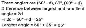 Geometry (Part-12)Total Questions: 5041. In triangle ABC, D is a point on BC such that BD : DC = 3 : 4. E is a point on AD such that AE : ED = 2 : 3. Find the ratio of area (∆ECD): area (ΔΑΕΒ). [SSC CGL 17/08/2021 (Evening)](a) 9 : 8(b) 1 : 2(c) 2 : 1(d) 8 : 9Correct Answer: (c) 2 : 1Solution:42. Point P lies outside a circle with centre O. Tangents PA and PB are drawn to meet the circle at A and B respectively. If ∠APB = 80°, then ∠OAB is equal to: [SSC CGL 18/08/2021 (Morning)](a) 140°(b) 40°(c) 70°(d) 35°Correct Answer: (b) 40°Solution:43. ΔABC~ ΔDEF If the areas of ΔABC and ΔDEF are 100 cm² and 81 cm², respectively and the altitude of ΔDEF is 6.3 cm, then the corresponding altitude (in cm) of ΔABC is: [SSC CGL 18/08/2021 (Morning)](a) 5.6(b) 9(c) 7(d) 8.4Correct Answer: (c) 7Solution:44. ∆ABC is an equilateral triangle. D is a point on side BC such that BD : BC = 1 : 3. If AD = 5√7cm, then the side of the triangle is: [SSC CGL 18/08/2021 (Afternoon)](a) 18cm(b) 12cm(c) 20cm(d) 15cmCorrect Answer: (d) 15cmSolution:45. In a trapezium PQRS, PQ is parallel to RS and diagonal PR and QS intersect at O. PQ = 4 cm, SR = 10cm, then what is area (∆POQ) : area (∆SOR)? [SSC CGL 18/08/2021 (Afternoon)](a) 4 : 25(b) 2 : 3(c) 4 : 9(d) 2 : 5Correct Answer: (a) 4 : 25Solution:46. A chord AB of circle C₁ of radius 17 cm touches circle C₂ which is concentric to C₁. The radius of C₂ is 8 cm. What is the length (in cm) of AB? [SSC CGL 18/08/2021 (Afternoon)](a) 30(b) 25(c) 20(d) 24Correct Answer: (a) 30Solution:47. In a right angled triangle ABC, the lengths of the sides containing the right angle are 5 cm and 12 cm respectively. A circle is inscribed in the triangle ABC. What is the radius of the circle (in cm)? [SSC CGL 18/08/2021 (Evening)](a) 2.8(b) 3(c) 2(d) 2.5Correct Answer: (c) 2Solution:48. Points A and B are on a circle with centre O. Point C is on the major arc АВ. If ∠OAC = 35° and ∠OBC = 45°, then what is the measure (in degrees) of the angle subtended by the minor arc AB at the centre? [SSC CGL 18/08/2021 (Evening)](a) 80(b) 70(c) 100(d) 160Correct Answer: (d) 160Solution:49. Triangle ABC is an equilateral triangle. D and E are points on AB and AC respectively such that DE is parallel to BC and is equal to half the length of BC. If AD + CE + BC = 30 cm, then find the perimeter (in cm) of the quadrilateral BCED. [SSC CGL 20/08/2021 (Morning)](a) 45(b) 25(c) 37.5(d) 35Correct Answer: (c) 37.5Solution:50. The angles of a triangle are in AP (arithmetic progression). If measure of the smallest angle is 50° less than that of the largest angle, then find the largest angle (in degrees) [SSC CGL 20/08/2021 (Afternoon)](a) 80(b) 85(c) 90(d) 75Correct Answer: (b) 85Solution:Submit Quiz« Previous12345
