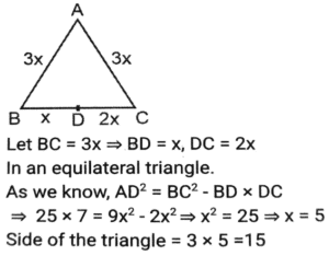 Geometry (Part-12)Total Questions: 5041. In triangle ABC, D is a point on BC such that BD : DC = 3 : 4. E is a point on AD such that AE : ED = 2 : 3. Find the ratio of area (∆ECD): area (ΔΑΕΒ). [SSC CGL 17/08/2021 (Evening)](a) 9 : 8(b) 1 : 2(c) 2 : 1(d) 8 : 9Correct Answer: (c) 2 : 1Solution:42. Point P lies outside a circle with centre O. Tangents PA and PB are drawn to meet the circle at A and B respectively. If ∠APB = 80°, then ∠OAB is equal to: [SSC CGL 18/08/2021 (Morning)](a) 140°(b) 40°(c) 70°(d) 35°Correct Answer: (b) 40°Solution:43. ΔABC~ ΔDEF If the areas of ΔABC and ΔDEF are 100 cm² and 81 cm², respectively and the altitude of ΔDEF is 6.3 cm, then the corresponding altitude (in cm) of ΔABC is: [SSC CGL 18/08/2021 (Morning)](a) 5.6(b) 9(c) 7(d) 8.4Correct Answer: (c) 7Solution:44. ∆ABC is an equilateral triangle. D is a point on side BC such that BD : BC = 1 : 3. If AD = 5√7cm, then the side of the triangle is: [SSC CGL 18/08/2021 (Afternoon)](a) 18cm(b) 12cm(c) 20cm(d) 15cmCorrect Answer: (d) 15cmSolution:45. In a trapezium PQRS, PQ is parallel to RS and diagonal PR and QS intersect at O. PQ = 4 cm, SR = 10cm, then what is area (∆POQ) : area (∆SOR)? [SSC CGL 18/08/2021 (Afternoon)](a) 4 : 25(b) 2 : 3(c) 4 : 9(d) 2 : 5Correct Answer: (a) 4 : 25Solution:46. A chord AB of circle C₁ of radius 17 cm touches circle C₂ which is concentric to C₁. The radius of C₂ is 8 cm. What is the length (in cm) of AB? [SSC CGL 18/08/2021 (Afternoon)](a) 30(b) 25(c) 20(d) 24Correct Answer: (a) 30Solution:47. In a right angled triangle ABC, the lengths of the sides containing the right angle are 5 cm and 12 cm respectively. A circle is inscribed in the triangle ABC. What is the radius of the circle (in cm)? [SSC CGL 18/08/2021 (Evening)](a) 2.8(b) 3(c) 2(d) 2.5Correct Answer: (c) 2Solution:48. Points A and B are on a circle with centre O. Point C is on the major arc АВ. If ∠OAC = 35° and ∠OBC = 45°, then what is the measure (in degrees) of the angle subtended by the minor arc AB at the centre? [SSC CGL 18/08/2021 (Evening)](a) 80(b) 70(c) 100(d) 160Correct Answer: (d) 160Solution:49. Triangle ABC is an equilateral triangle. D and E are points on AB and AC respectively such that DE is parallel to BC and is equal to half the length of BC. If AD + CE + BC = 30 cm, then find the perimeter (in cm) of the quadrilateral BCED. [SSC CGL 20/08/2021 (Morning)](a) 45(b) 25(c) 37.5(d) 35Correct Answer: (c) 37.5Solution:50. The angles of a triangle are in AP (arithmetic progression). If measure of the smallest angle is 50° less than that of the largest angle, then find the largest angle (in degrees) [SSC CGL 20/08/2021 (Afternoon)](a) 80(b) 85(c) 90(d) 75Correct Answer: (b) 85Solution:Submit Quiz« Previous12345