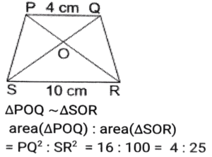 Geometry (Part-12)Total Questions: 5041. In triangle ABC, D is a point on BC such that BD : DC = 3 : 4. E is a point on AD such that AE : ED = 2 : 3. Find the ratio of area (∆ECD): area (ΔΑΕΒ). [SSC CGL 17/08/2021 (Evening)](a) 9 : 8(b) 1 : 2(c) 2 : 1(d) 8 : 9Correct Answer: (c) 2 : 1Solution:42. Point P lies outside a circle with centre O. Tangents PA and PB are drawn to meet the circle at A and B respectively. If ∠APB = 80°, then ∠OAB is equal to: [SSC CGL 18/08/2021 (Morning)](a) 140°(b) 40°(c) 70°(d) 35°Correct Answer: (b) 40°Solution:43. ΔABC~ ΔDEF If the areas of ΔABC and ΔDEF are 100 cm² and 81 cm², respectively and the altitude of ΔDEF is 6.3 cm, then the corresponding altitude (in cm) of ΔABC is: [SSC CGL 18/08/2021 (Morning)](a) 5.6(b) 9(c) 7(d) 8.4Correct Answer: (c) 7Solution:44. ∆ABC is an equilateral triangle. D is a point on side BC such that BD : BC = 1 : 3. If AD = 5√7cm, then the side of the triangle is: [SSC CGL 18/08/2021 (Afternoon)](a) 18cm(b) 12cm(c) 20cm(d) 15cmCorrect Answer: (d) 15cmSolution:45. In a trapezium PQRS, PQ is parallel to RS and diagonal PR and QS intersect at O. PQ = 4 cm, SR = 10cm, then what is area (∆POQ) : area (∆SOR)? [SSC CGL 18/08/2021 (Afternoon)](a) 4 : 25(b) 2 : 3(c) 4 : 9(d) 2 : 5Correct Answer: (a) 4 : 25Solution:46. A chord AB of circle C₁ of radius 17 cm touches circle C₂ which is concentric to C₁. The radius of C₂ is 8 cm. What is the length (in cm) of AB? [SSC CGL 18/08/2021 (Afternoon)](a) 30(b) 25(c) 20(d) 24Correct Answer: (a) 30Solution:47. In a right angled triangle ABC, the lengths of the sides containing the right angle are 5 cm and 12 cm respectively. A circle is inscribed in the triangle ABC. What is the radius of the circle (in cm)? [SSC CGL 18/08/2021 (Evening)](a) 2.8(b) 3(c) 2(d) 2.5Correct Answer: (c) 2Solution:48. Points A and B are on a circle with centre O. Point C is on the major arc АВ. If ∠OAC = 35° and ∠OBC = 45°, then what is the measure (in degrees) of the angle subtended by the minor arc AB at the centre? [SSC CGL 18/08/2021 (Evening)](a) 80(b) 70(c) 100(d) 160Correct Answer: (d) 160Solution:49. Triangle ABC is an equilateral triangle. D and E are points on AB and AC respectively such that DE is parallel to BC and is equal to half the length of BC. If AD + CE + BC = 30 cm, then find the perimeter (in cm) of the quadrilateral BCED. [SSC CGL 20/08/2021 (Morning)](a) 45(b) 25(c) 37.5(d) 35Correct Answer: (c) 37.5Solution:50. The angles of a triangle are in AP (arithmetic progression). If measure of the smallest angle is 50° less than that of the largest angle, then find the largest angle (in degrees) [SSC CGL 20/08/2021 (Afternoon)](a) 80(b) 85(c) 90(d) 75Correct Answer: (b) 85Solution:Submit Quiz« Previous12345
