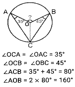 Geometry (Part-12)Total Questions: 5041. In triangle ABC, D is a point on BC such that BD : DC = 3 : 4. E is a point on AD such that AE : ED = 2 : 3. Find the ratio of area (∆ECD): area (ΔΑΕΒ). [SSC CGL 17/08/2021 (Evening)](a) 9 : 8(b) 1 : 2(c) 2 : 1(d) 8 : 9Correct Answer: (c) 2 : 1Solution:42. Point P lies outside a circle with centre O. Tangents PA and PB are drawn to meet the circle at A and B respectively. If ∠APB = 80°, then ∠OAB is equal to: [SSC CGL 18/08/2021 (Morning)](a) 140°(b) 40°(c) 70°(d) 35°Correct Answer: (b) 40°Solution:43. ΔABC~ ΔDEF If the areas of ΔABC and ΔDEF are 100 cm² and 81 cm², respectively and the altitude of ΔDEF is 6.3 cm, then the corresponding altitude (in cm) of ΔABC is: [SSC CGL 18/08/2021 (Morning)](a) 5.6(b) 9(c) 7(d) 8.4Correct Answer: (c) 7Solution:44. ∆ABC is an equilateral triangle. D is a point on side BC such that BD : BC = 1 : 3. If AD = 5√7cm, then the side of the triangle is: [SSC CGL 18/08/2021 (Afternoon)](a) 18cm(b) 12cm(c) 20cm(d) 15cmCorrect Answer: (d) 15cmSolution:45. In a trapezium PQRS, PQ is parallel to RS and diagonal PR and QS intersect at O. PQ = 4 cm, SR = 10cm, then what is area (∆POQ) : area (∆SOR)? [SSC CGL 18/08/2021 (Afternoon)](a) 4 : 25(b) 2 : 3(c) 4 : 9(d) 2 : 5Correct Answer: (a) 4 : 25Solution:46. A chord AB of circle C₁ of radius 17 cm touches circle C₂ which is concentric to C₁. The radius of C₂ is 8 cm. What is the length (in cm) of AB? [SSC CGL 18/08/2021 (Afternoon)](a) 30(b) 25(c) 20(d) 24Correct Answer: (a) 30Solution:47. In a right angled triangle ABC, the lengths of the sides containing the right angle are 5 cm and 12 cm respectively. A circle is inscribed in the triangle ABC. What is the radius of the circle (in cm)? [SSC CGL 18/08/2021 (Evening)](a) 2.8(b) 3(c) 2(d) 2.5Correct Answer: (c) 2Solution:48. Points A and B are on a circle with centre O. Point C is on the major arc АВ. If ∠OAC = 35° and ∠OBC = 45°, then what is the measure (in degrees) of the angle subtended by the minor arc AB at the centre? [SSC CGL 18/08/2021 (Evening)](a) 80(b) 70(c) 100(d) 160Correct Answer: (d) 160Solution:49. Triangle ABC is an equilateral triangle. D and E are points on AB and AC respectively such that DE is parallel to BC and is equal to half the length of BC. If AD + CE + BC = 30 cm, then find the perimeter (in cm) of the quadrilateral BCED. [SSC CGL 20/08/2021 (Morning)](a) 45(b) 25(c) 37.5(d) 35Correct Answer: (c) 37.5Solution:50. The angles of a triangle are in AP (arithmetic progression). If measure of the smallest angle is 50° less than that of the largest angle, then find the largest angle (in degrees) [SSC CGL 20/08/2021 (Afternoon)](a) 80(b) 85(c) 90(d) 75Correct Answer: (b) 85Solution:Submit Quiz« Previous12345