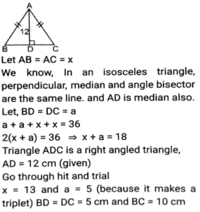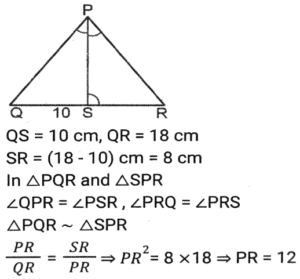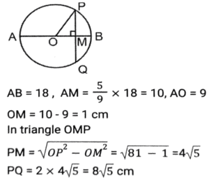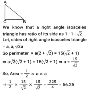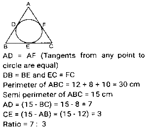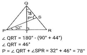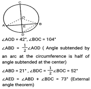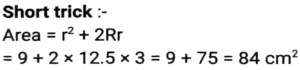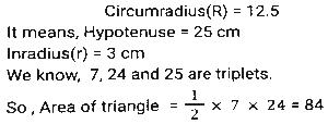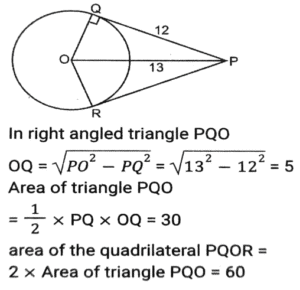 Geometry (Part-13)Total Questions: 3511. In a circle with centre O, Chord AB and diameter CD intersect each other at point E, inside the circle. If ∠AOD = 42º and ∠BOC = 104º then what is the measure (in degrees) of ∠AED? [SSC CHSL 04/08/2021 (Evening)](a) 73°(b) 62°(c) 58°(d) 84°Correct Answer: (a) 73°Solution:12. In an isosceles triangle ABC, AB = AC and AD is perpendicular to BC. If AD = 12 cm and the perimeter of of ∆ABC is 36 cm, then the length of BC (in cm) is: [SSC CHSL 05/08/2021 (Morning)](a) 5(b) 12(c) 10(d) 13Correct Answer: (c) 10Solution:13. The in-radius and circumradius of a right-angled triangle is 3 cm and 12.5 cm, respectively. The area of the triangle (in cm²) is: [SSC CHSL 05/08/2021 (Evening)](a) 64(b) 48(c) 88(d) 84Correct Answer: (d) 84Solution:14. Point A, B, C and D are concyclic points of a circle with centre O, such that ∠DOC = 73°. The measure of ∠AOC is 215°. What is the measure of ∠AOD? [SSC CHSL 06/08/2021 (Afternoon)](a) 145°(b) 273°(c) 87°(d) 72°Correct Answer: (d) 72°Solution:15. AB is the diameter of a circle of radius 9 cm. PQ is a chord (not a diameter) that intersects AB at M perpendicularly. If AM : BM = 5 : 4 then the length of chord PQ will be: [SSC CHSL 09/08/2021 (Afternoon)](a) 5√5(b) 6√3(c) 6√5(d) 8√5Correct Answer: (d) 8√5Solution:16. If the perimeter of an isosceles right triangle is 15(√2 + 1) cm, then the area of the triangle (in cm²) will be: [SSC CHSL 09/08/2021 ((Afternoon)](a) 46.5(b) 45(c) 56.25(d) 55Correct Answer: (c) 56.25Solution:17. If S is a point on side QR of a triangle PQR such that QS = 10 cm, QR = 18 cm and ∠PSR = ∠QPR, then the length of PR (in cm) will be: [SSC CHSL 10/08/2021 (Afternoon)](a) 16(b) 12(c) 15(d) 14Correct Answer: (b) 12Solution:18. In ∆PQR, QT⊥PR and S is a point on QR such that ∠PSQ = P°. If ∠TQR = 44° and ∠SPR = 32°, then the value of P is: [SSC CHSL 10/08/2021 (Evening)](a) 72°(b) 82°(c) 76°(d) 78°Correct Answer: (d) 78°Solution:19. The sides AB, BC and AC of ∆ABC are 12 cm, 8 cm and 10 cm, respectively. A circle is inscribed in the triangle touching AB, BC and AC at D, E and F respectively. The ratio of the lengths of AD to CE is: [SSC CHSL 10/08/2021 (Evening)](a) 5 : 7(b) 3 : 5(c) 10 : 7(d) 7 : 3Correct Answer: (d) 7 : 3Solution:20. From a point P, which is at a distance of 13 cm from the centre O of a circle, a pair of tangents PQ and PR of length 12 cm are drawn to the circle. The area of the quadrilateral PQOR is: [SSC CHSL 11/08/2021 (Morning)](a) 50(b) 76(c) 80(d) 60Correct Answer: (d) 60Solution:Submit Quiz« Previous1234Next »