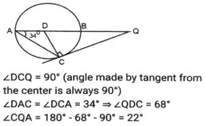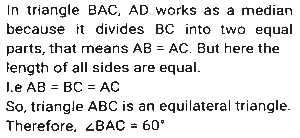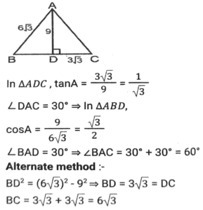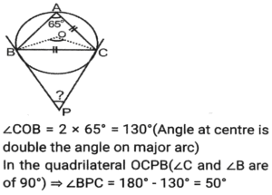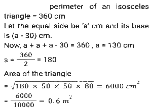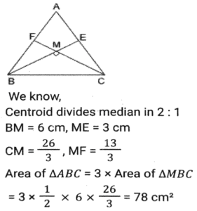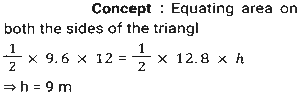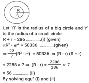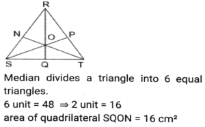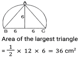 Geometry (Part-13)Total Questions: 3521. The area (in cm²) of the largest triangle that can be inscribed in a semicircle of radius 6 cm is: [SSC CHSL 11/08/2021 (Evening)](a) 36(b) 34(c) 35(d) 38Correct Answer: (a) 36Solution:22. The altitude AD of a triangle ABC is 9 cm. If AB = 6√3 cm and CD = 3√3 cm, then what will be the measure of ∠A ? [SSC CHSL 12/04/2021 (Morning)](a) 90º(b) 30º(c) 45º(d) 60ºCorrect Answer: (d) 60ºSolution:23. ∆ABC is drawn in a circle such that AC = BC and ∠BAC = 65º. From points B and C two tangents are drawn which intersect at point P. What is the measure of ∠BPC ? [SSC CHSL 12/08/2021 (Afternoon)](a) 52.5°(b) 50º(c) 55°(d) 32.5°Correct Answer: (b) 50ºSolution:24. Two sides of a triangle are 12.8 m and 9.6 m. If the height of the triangle is 12 m, corresponding to 9.6 m, then what is its height (in m) corresponding to 12.8 m? [SSC CHSL 13/04/2021 (Afternoon)](a) 12(b) 9(c) 10(d) 8Correct Answer: (b) 9Solution:25. AB is a diameter of the circle with centre D. The tangent at the point C on the circle meets AB produced at Q. If ∠BAC 34°, then the measure of ∠CQA (in degrees) will be: [SSC CHSL 15/04/2021 (Morning)](a) 26°(b) 36°(c) 22°(d) 24°Correct Answer: (c) 22°Solution:26. The perimeter of an isosceles triangle is 3.6 m and its base is 30 cm shorter than each of the equal side. What is the area (in m²) of the triangle? [SSC CHSL 15/04/2021 (Afternoon)](a) 0.6(b) 0.72(c) 0.54(d) 0.8Correct Answer: (a) 0.6Solution:27. The sum of the radius of two circles is 286 cm and the area between the concentric circles is 50336 cm² What are the radius (in cm) of the two circles? Take (π = 22/7) [SSC CHSL 15/04/2021 (Afternoon)](a) 115 and 91(b) 115 and 171(c) 91 and 84(d) 171 and 84Correct Answer: (b) 115 and 171Solution:28. The three medians RQ, SP and TN of ∆RST intersect at point O. If the area of ∆RST is 48 cm², then the area of quadrilateral SQON is: (in cm²) [SSC CHSL 15/04/2021 (Evening)](a) 20(b) 12(c) 16(d) 18Correct Answer: (c) 16Solution:29. Two circular football grounds of radius 42 m and 35 m are to be replaced with a bigger circular ground. What would be the radius of this new ground if the new ground has the same area as the sum of the two small grounds? (in meter) [SSC CHSL 15/04/2021 (Evening)](a) √2979(b) √2981(c) √2999(d) √2989Correct Answer: (d) √2989Solution:Let radius of new ground = R π(42² + 35²) = πR² ⇒ R = √(2989) m30. In ∆ABC , medians BE and CF are perpendicular to each other and intersect at M. If BE = 9 cm and CF = 13 cm, then the area of ∆ABC will be: (in cm²) [SSC CHSL 15/4/2021 (Evening)](a) 75(b) 78(c) 76(d) 68Correct Answer: (b) 78Solution:Submit Quiz« Previous1234Next »