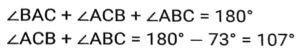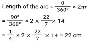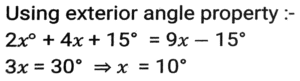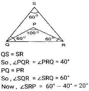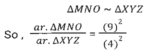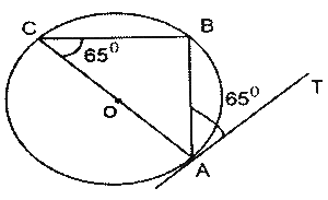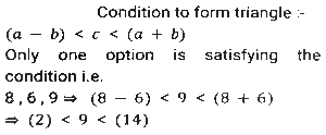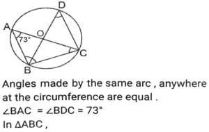 Geometry (Part-7)Total Questions: 5041. Two triangles MNO and XYZ are given similar with the ratio of their side as 9:4. If the area of the larger triangle is 243 sq.cm, then the area of smaller triangle will be: [SSC CHSL 02/08/2023 (3rd Shift)](a) 162 sq.cm(b) 28 sq.cm(c) 48 sq.cm(d) 16 sq.cmCorrect Answer: (c) 48 sq.cmSolution:42. In a circle of radius 14 cm, an arc subtends an angle of 90° at the centre. The length of arc (in cm) is equal to: (Take π= 22/)7 [SSC CHSL 02/08/2023 (3rd Shift)](a) 22(b) 18(c) 20(d) 24Correct Answer: (a) 22Solution:43. AB is a chord of the circle and AOC is its diameter such that angle ACB = 65°. If AT is the tangent to the circle at the point A, then angle BAT is equal to: [SSC CHSL 02/08/2023 (4th Shift)](a) 65°(b) 75°(c) 55°(d) 40°Correct Answer: (a) 65°Solution:Alternate segament theorem :- In any circle, the angle between a chord and a tangent through one of the endpoints of the chord is equal to the angle made by the same chord in the alternate segament44. ∆PQR and ∆SQR are both isosceles triangles on a common base QR such that P and S lie on the same side of QR. If ∠QSR = 60° and ∠QPR = 100°, then find ∠SRP. [SSC CHSL 03/08/2023 (1st Shift)](a) 80°(b) 60°(c) 100°(d) 20°Correct Answer: (d) 20°Solution:45. Which option with given sides forms a Triangle? [SSC CHSL 03/08/2023 (2nd Shift)](a) 8, 6, 9(b) 100, 200, 300(c) 10, 25, 11(d) 8, 2, 6Correct Answer: (a) 8, 6, 9Solution:46. In a triangle PQR, QR is produced to S. If ∠PRS = (9x - 15)º, ∠RPQ = (2x)º and ∠PQR = (4x + 15)º, what is the value of x ? [SSC CHSL 03/08/2023 (3rd Shift)](a) 55°(b) 20°(c) 10°(d) 75°Correct Answer: (c) 10°Solution:47. If in ∆PQR and ∆DEF, ∠P = 52º, ∠Q = 74º, ∠R = 54º, ∠D = 54º, ∠E = 74º, and ∠F = 52º, then which of the following is correct? [SSC CHSL 03/08/2023 (3rd Shift)](a) ∆PQR ~ ∆FED(b) ∆RQP ~ ∆FED(c) ∆PRQ ~ ∆FED(d) ∆PQR ~ ∆DEFCorrect Answer: (a) ∆PQR ~ ∆FEDSolution:∠P = ∠F = 52º, ∠Q = ∠E = 74º ∠R = ∠D = 54º So, ∆PQR ~ ∆FED48. Minor arc BC subtends angles BAC and BDC at points A and D, respectively, on the circumference in the major sector of the circle with centre O. What is the value (in degrees) of (∠ABC + ∠ACB), if ∠BDC = 73º ? [SSC CHSL 03/08/2023 (4th Shift)](a) 117°(b) 107°(c) 103°(d) 113°Correct Answer: (b) 107°Solution:49. In ∆ABC, the internal bisectors of ∠ABC and ∠ACB meet at X and ∠BAC = 30°. The measure of ∠BXC is: [SSC CHSL 03/08/2023 (4th Shift)](a) 120°(b) 115°(c) 105°(d) 150°Correct Answer: (c) 105°Solution:50. In triangle RST, M and N are two points on RS and RT such that MN is parallel to the base ST of the triangle RST. If RM = 1/3 MS, and ST = 5.6 cm, what is the ratio of Area of Triangle RMN/Area of Trapezium MNST ? [SSC CHSL 04/08/2023 (1st Shift)](a) 14/15(b) 15/16(c) 1/15(d) 1/16Correct Answer: (c) 1/15Solution:Submit Quiz« Previous12345