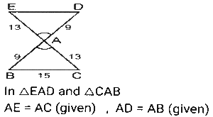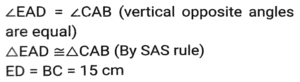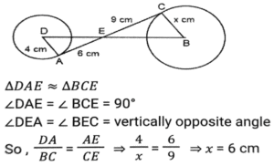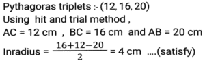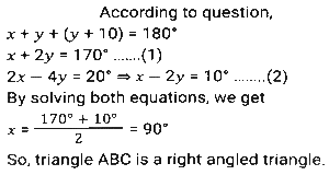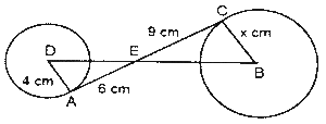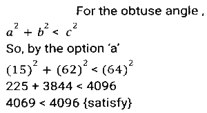 Geometry (Part-9)Total Questions: 5021. When two circles of radii r₁ and r₂ have their centres at a distance d apart, then length of the common transverse tangent is: [SSC CGL 25/07/2023 (1st shift)](a)(b)(c)(d)Correct Answer: (d)Solution:22. The three sides of two triangles are 4, 5 and 6 cm. Select the INCORRECT statement. [SSC CGL 25/07/2023 (2nd shift)](a) The angle opposite to the greater side in those triangles will be greater.(b) The area of the two triangles will be different.(c) The two triangles are congruent.(d) The two triangles are scalene triangles.Correct Answer: (b) The area of the two triangles will be different.Solution:Three sides of two triangles are 4, 5 and 6 cm respectively. So, The area of these triangles will always be same. Hence, Option 'b' is incorrect.23. In the following figure, the circles with centres D and B have radii 4 cm and x cm, respectively. AC is a tangent to both the circles. Find the value of x. [SSC CGL 25/07/2023 (4th shift)](a) 6(b) 3(c) 7(d) 5Correct Answer: (a) 6Solution:24. In the figure given below, PQ is the diameter of the circle with centre O. If ∠QOR = 100º then the measure of ∠PSR is: [SSC CGL 25/07/2023 (4th shift)](a) 160°(b) 80°(c) 40°(d) 100°Correct Answer: (c) 40°Solution:25. A circle of radius 4 cm is drawn inscribed in a right angle triangle ABC, right angled at C. If AC = 12 cm, then the value of CB is: [SSC CGL 25/07/2023 (4th shift)](a) 8 cm(b) 12 cm(c) 20 cm(d) 16 cmCorrect Answer: (d) 16 cmSolution:26. Which of the following sets of lengths (in cm) will give three sides of an obtuse-angled triangle? [SSC CGL 26/07/2023 (1st shift)](a) 15, 62, 64(b) 17, 64, 66(c) 16, 63, 65(d) 18, 65, 67Correct Answer: (a) 15, 62, 64Solution:27. In a triangle ABC, the three angles are x, y and y + 10. Also, 2x - 4y = 20º. Which type of triangle is ABC? [SSC CGL 26/07/2023 (3rd shift)](a) Equilateral(b) Obtuse(c) Acute(d) Right-angledCorrect Answer: (d) Right-angledSolution:28. In the figure, AB = AD = 9 cm and AC = AE = 13 cm and BC = 15 cm. Find ED? [SSC CGL 27/07/2023 (1st shift)](a) 18 cm(b) 16 cm(c) 14 cm(d) 15 cmCorrect Answer: (d) 15 cmSolution:29. If in acute angled triangle ABC, AL, BM and CN are the three altitudes of triangle ABC, then which of the following statements will be true? [SSC CGL 27/07/2023 (2nd shift)](a) AL + BM + CN = AB + BC + CA(b) AL + BM = AB + BC(c) AL + BM + CN > AB + BC + CA(d) AL + BM + CN < AB + BC + CACorrect Answer: (d) AL + BM + CN < AB + BC + CASolution:As we know , Sum of the three altitudes of a triangle is always less than the sum of its side. AL + BM + CN < AB + BC + CA30. Select the correct statement about the properties of a triangle. [SSC CGL 27/07/2023 (3rd shift)](a) The sum of two sides is always equal to the third side.(b) The sum of two sides may be equal to the third side.(c) The sum of two sides is always greater than the third side.(d) The sum of two sides is always less than the third sideCorrect Answer: (c) The sum of two sides is always greater than the third side.Solution:The sum of two sides is always greater than the third side.Submit Quiz« Previous12345Next »