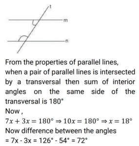 Geometry (Railway Maths) (Part – II)Total Questions: 5041. Which of the following is true for a square ? [Group D 29/08/2022 (Morning)](a) All angles equal (b) All sides parallel (c) Diagonals equal (d) All sides equal(a) a, b(b) a, c, d(c) a, b, c(d) b, c, dCorrect Answer: (b) a, c, dSolution:A square has all angles equal, all sides are equal , and two diagonals are equal. So, only option a, c and d follow.42. If the opposite angles of a cyclic quadrilateral are in the ratio 3 : 7, then the measure of the bigger angle among the two is : [Group D 29/08/2022 (Morning)](a) 140°(b) 126°(c) 70°(d) 105°Correct Answer: (b) 126°Solution:43. Find the circumference of a circle that circumscribes a square of side 7 cm. (use π = 22/7) [Group D 29/08/2022 (Afternoon)](a) 44√2 cm(b) 22 cm(c) 44 cm(d) 22√2 cmCorrect Answer: (d) 22√2 cmSolution:44. If a regular polygon has 65 diagonals, then the sum of its interior angles is: [Group D 29/08/2022 (Evening) ](a) 1800°(b) 1620°(c) 1980°(d) 1440°Correct Answer: (c) 1980°Solution:45. If one angle of a triangle is equal to the sum of the other two angles, then the triangle is: [Group D 29/08/2022 (Evening) ](a) an obtuse angle triangle(b) an equilateral triangle(c) an isosceles triangle(d) a right-angle triangleCorrect Answer: (d) a right-angle triangleSolution:46. The point of intersection of the medians of a triangle is called : [Group D 30/08/2022 (Morning) ](a) Circumcentre(b) Orthocentre(c) Incentre(d) CentroidCorrect Answer: (d) CentroidSolution:The point of intersection of all the medians of a triangle is the centroid of the triangle. A median of a triangle is a line segment from one vertex to the midpoint on the opposite side of the triangle47. A pair of parallel lines is intersected by a transversal such that <1 and <2 form a pair of alternate interior angles. If m <1 = 35°, what is the measure of <2? [Group D 30/08/2022 (Afternoon) ](a) 35°(b) 145°(c) 55°(d) 65°Correct Answer: (a) 35°Solution:48. If the ratio of two interior angles on the same side of a transversal line intersecting the two parallel lines is 3 : 7, then what is the positive difference between the measures of these two interior angles? [Group D 30/08/2022 (Afternoon) ](a) 54°(b) 80(c) 72°(d) 64°Correct Answer: (c) 72°Solution:49. In a parallelogram PQRS, the bisectors of consecutive angles of P and Q intersect at T. What is the measure of <PTQ? [Group D 30/08/2022 (Evening) ](a) 80°(b) 90°(c) 70°(d) 50°Correct Answer: (b) 90°Solution:50. In triangle ABC, if the angles are in the ratio 4 : 3 : 5, find the angles. [Group D 01/09/2022 (Morning) ](a) 20°, 15°, 25°(b) 40°, 30°, 50°(c) 20°, 50°, 70°(d) 60°, 45°, 75°Correct Answer: (d) 60°, 45°, 75°Solution:Submit Quiz« Previous12345
