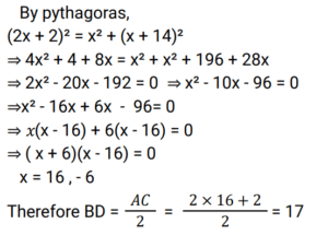 Geometry (Railway Maths) (Part – III)Total Questions: 5021. If ABCD is a rhombus such that <ACB = 50°, then <BDC will be: [Group D 08/09/2022 (Evening) ](a) 55°(b) 50°(c) 40°(d) 60°Correct Answer: (c) 40°Solution:22. In the given figure, I || m and t is a transversal. If <1 and <2 are in the ratio 4 : 11, the measures of the angles <7 and <8, respectively, are: [Group D 09/09/2022 (Morning) ](a) 110° and 70°(b) 87° and 93°(c) 132° and 48°(d) 65° and 115°Correct Answer: (c) 132° and 48°Solution:23. In a quadrilateral ABCD, if the sum of angles ∠B and ∠D be 150° while angles ∠A and ∠C are in ratio 4 : 3, then the measure of ∠C will be: [Group D 09/09/2022 (Morning)](a) 120°(b) 90°(c) 150°(d) 210°Correct Answer: (b) 90°Solution:24. In ΔMNO, ∠N = ∠O and NO = 12 cm, MO = 10 cm and MP be the altitude, then the length of MP is: [Group D 09/09/2022 (Afternoon)](a) 8 cm(b) 10 cm(c) 3 cm(d) 11 cmCorrect Answer: (a) 8 cmSolution:25. In the given figure, lines AB and CD are parallel to line FG. E is a point on the line FG. It is given that ∠ABE = 110°, ∠ECD = 95° and ∠BEC = x°. The value of x is: [Group D 09/09/2022 (Evening)](a) 25°(b) 80°(c) 60°(d) 30°Correct Answer: (a) 25°Solution:26. In the given figure, if ∆ABC and ∆ DEF are similar, then the ratio of CA to FD will be: [Group D 12/09/2022 (Morning) ](a) 3 : 7(b) 5 : 7(c) 3 : 4(d) 3 : 8Correct Answer: (d) 3 : 8Solution:27. In quadrilateral PQRS, the bisectors of ∠R and ∠S meet at the point T (inside the quadrilateral) and ∠STR = 87.5°. If the ratio of ∠P to ∠Q is 2 : 3, then what is the difference between the measures of ∠Q and ∠P ? [Group D 12/09/2022 (Afternoon)](a) 25°(b) 40°(c) 35°(d) 45°Correct Answer: (c) 35°Solution:28. The hypotenuse of a right-angled triangle is 2 more than twice of one of the sides, while the third side is 13 more than half of the hypotenuse. The length of the median to the hypotenuse is: [Group D 12/09/2022 (Afternoon)](a) 15(b) 18(c) 17(d) 20Correct Answer: (c) 17Solution:29. It is given that ΔABC ≅ ΔFDE and AB = 6 cm, ∠B = 60° and ∠A = 70°, then which of the following is true? [Group D 12/09/2022 (Evening)](a) DE = 5 cm, ∠E = 50°(b) DF = 6 cm, ∠E = 50°(c) DE = 6 cm, ∠D = 40°(d) DF = 6 cm, ∠F = 50°Correct Answer: (b) DF = 6 cm, ∠E = 50°Solution:30. In the given figure, in ∆ABC, DE || BC, AD = 7 cm, AE = 3.5 cm and DB = 6 cm cm. What is the value of AC ? [Note: Diagram is not drawn to scale or measurements indicated.] [Group D 13/09/2022 (Afternoon) ](a) 3 cm(b) 4.5 cm(c) 4 cm(d) 6.5 cmCorrect Answer: (d) 6.5 cmSolution:Submit Quiz« Previous12345Next »