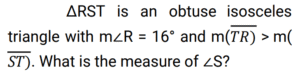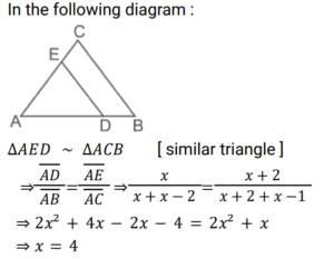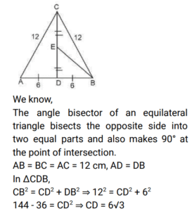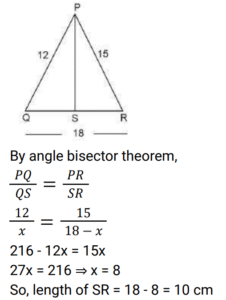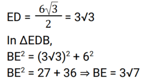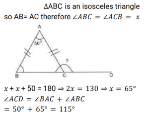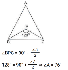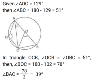 Geometry (Railway Maths) (Part – IV)Total Questions: 5021. ΔABC is an equilateral triangle with side 12 cm. CD is the bisector of ∠C which meets AB at D and E is the mid-point of CD. What is the length of BE? [Level 2 (13/06/2022) Shift 2](a) 3√6 cm(b) 8 cm(c) 3√7 cm(d) 6√2 cmCorrect Answer: (c) 3√7 cmSolution:22. In ΔABC, the bisectors of ∠B and ∠C intersect at P inside the triangle. If ∠BPC = 128°, then what is the measure of ∠A? [Level 3 (14/06/2022) Shift 1](a) 52°(b) 78°(c) 76°(d) 82°Correct Answer: (c) 76°Solution:23. Two chords AB and CD of a circle intersect at point F inside the circle. If AF = 4 cm, BF = 6 cm and CF = 3 cm, then find the length of CD. [Level 3 (14/06/2022) Shift 2](a) 8 cm(b) 11 cm(c) 16 cm(d) 12 cmCorrect Answer: (b) 11 cmSolution:24. The bisector of ∠QPR of ΔPQR meets the side QR at S. If PQ = 12 cm, PR = 15 cm and QR = 18 cm, then the length of SR is: [Level 3 (14/06/2022) Shift 2](a) 10 cm(b) 12 cm(c) 8 cm(d) 13 cmCorrect Answer: (a) 10 cmSolution:25. The sides AB, BC, CD and DA of a quadrilateral ABCD touch a circle at P,Q,R and S, respectively . if the AB =16 cm, DS = 10 cm and RC=3 cm, then find the perimeter of the quadrilateral ABCD (in cm). [Level 5 (15/06/2022) Shift 3 ](a) 56(b) 60(c) 58(d) 55Correct Answer: (c) 58Solution:26. The altitude of an equilateral triangle is 12 cm. What is the perimeter of the triangle? [Level 2 (16/06/2022) Shift 1 ](a) 30√3 cm(b) 24√3 cm(c) 43 cm(d) 18√3 cmCorrect Answer: (b) 24√3 cmSolution:27. Find the answer of given question? [Level 2 (16/06/2022) Shift 1 ](a) 164°(b) 144°(c) 148°(d) 16°Correct Answer: (c) 148°Solution:28. ABCD is a cyclic quadrilateral whose side AB is a diameter of the circlethrough A,B,C and D. if <ADC = 129°, then what is the measure of <BAC? [Level 2 (16/06/2022) Shift 2 ](a) 39°(b) 49°(c) 41°(d) 51°Correct Answer: (a) 39°Solution:29. In the given figure, DE II BC. if AD = x, DB = x - 2, AE = x + 2 and EC = x - 1, then find the value of x. [Level 3 (17/06/2022) Shift 1 ](a) 3(b) 4(c) 5(d) 2Correct Answer: (b) 4Solution:30. ABC is an isosceles triangle in which AB = AC and BAC = 50⁰. Side BC is extended to D. Find the measure of <ACD. [Level 3 (17/06/2022) Shift 1 ](a) 100⁰(b) 130⁰(c) 110⁰(d) 115⁰Correct Answer: (d) 115⁰Solution:Submit Quiz« Previous12345Next »