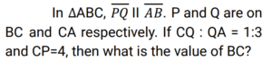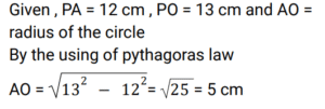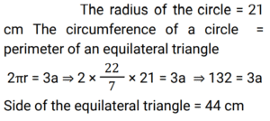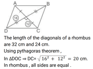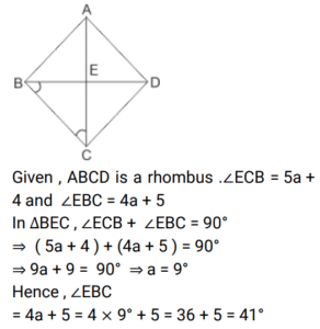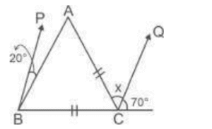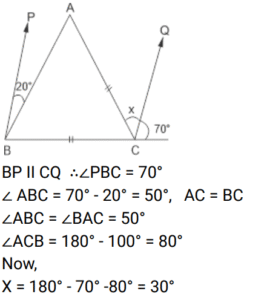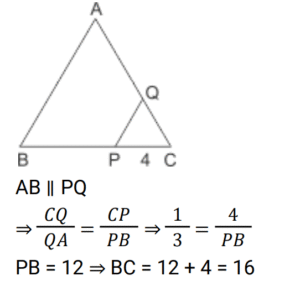 Geometry (Railway Maths) (Part – VI)Total Questions: 5021. ABCD is a parallelogram in which ∠A = x + 20° and ∠C = 3x - 10°. The value of x is __________ [RRB NTPC 05/03/2021 (Evening)](a) 15°(b) 30°(c) 40°(d) 60°Correct Answer: (a) 15°Solution:Angle A will be equal to the angle C , both are opposite angles of a parallelogram x + 20° = 3x - 10° ⇒ 2x = 30° ⇒ x = 15°22. Find the answer of given question? [RRB NTPC 07/03/2021 (Morning)](a) 16(b) 12(c) 8(d) 4Correct Answer: (a) 16Solution:23. Two intersecting circles are said to be orthogonal if the angle between them is a/an __________. [RRB NTPC 07/03/2021 (Morning)](a) straight angle(b) acute angle(c) obtuse angle(d) right angleCorrect Answer: (d) right angleSolution:Two intersecting circles are said to be orthogonal if the angle between them is a right angle.24. If the length of the diagonals of a rhombus are 32 cm and 24 cm, then the length of each side of the rhombus will be: [RRB NTPC 08/03/2021 (Morning)](a) 30 cm(b) 20 cm(c) 40 cm(d) 10 cmCorrect Answer: (b) 20 cmSolution:25. The circumference of a circle is equal to the perimeter of an equilateral triangle. If the radius of the circle is 21 cm, what is the length of the side of the equilateral triangle? [RRB NTPC 08/03/2021 (Evening) ](a) 44 cm(b) 22 cm(c) 55 cm(d) 33 cmCorrect Answer: (a) 44 cmSolution:26. The sum of the angles of the various sections in a pie diagram is: [RRB NTPC 09/03/2021 (Morning) ](a) 270⁰(b) 360⁰(c) 180⁰(d) 90⁰Correct Answer: (b) 360⁰Solution:The sum of the angles of the various sections in a pie diagram is = 360°27. In given figure, if BP II CQ and AC = BC, then the measure of x is: [RRB NTPC 11/03/2021 (Morning) ](a) 35⁰(b) 20⁰(c) 25⁰(d) 30⁰Correct Answer: (d) 30⁰Solution:28. The diagonals of a quadrilateral ABCD bisect each other. In this quadrilateral, if ∠A = 45° then ∠B = ? [RRB NTPC 11/03/2021 (Morning)](a) 120°(b) 135°(c) 125°(d) 115°Correct Answer: (b) 135°Solution:<A + <B = 180° <B = 180° - 45° = 135°29. In rhombus ABCD, the diagonals intersect at point E. IF ∠ECB = 5a + 4 and ∠EBC = 4a + 5. Find ∠EBC. [RRB NTPC 11/03/2021 (Evening)](a) 49°(b) 41°(c) 45°(d) 35°Correct Answer: (b) 41°Solution:30. A point is 13 cm from the center of a circle. The length of the tangent drawn from P to the circle is 12 cm. Find the radius of the circle. [RRB NTPC 12/03/2021 (Evening)](a) 5 cm(b) 4 cm(c) 6 cm(d) 3 cmCorrect Answer: (a) 5 cmSolution:Submit Quiz« Previous12345Next »