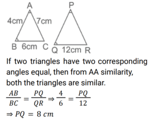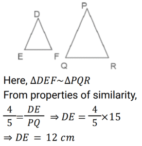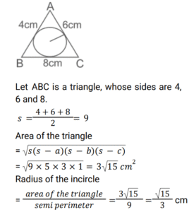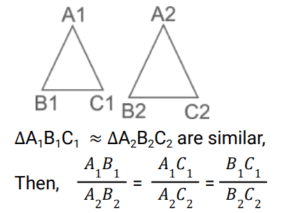 Geometry (Railway Maths) (Part – VII)Total Questions: 4721. What is the maximum number of parallel tangents a circle can have? [ALP Tier II 21/01/2019 (Afternoon) ](a) four(b) two(c) three(d) infiniteCorrect Answer: (b) twoSolution:The Maximum number of parallel tangents that can be drawn on a circle is two.22. The sides of a triangle are 4 cm, 6 cm and 8 cm respectively. Find the radius of the incircle of the Triangle? [ALP Tier II 21/01/2019 (Afternoon) ](a) √5 cm(b) 5 cm(c) √5/3 cm(d) √15/3 cmCorrect Answer: (d) √15/3 cmSolution:23. If the triangles A₁B₁C₁ and A₂B₂C₂ are similar, then which of the following option will be correct? [ALP Tier II 21/01/2019 (Afternoon) ](a)(b)(c)(d)Correct Answer: (d)Solution:24. If in triangle ABC, AB = 4 cm, BC = 6 cm and AC = 7 cm and in triangle PQR, QR = 12 cm and <A = ∠P, ∠B = ∠Q, then Find out the length of PQ? [ALP Tier II 21/01/2019 (Afternoon)](a) 8 cm(b) 12 cm(c) 14 cm(d) 10 cmCorrect Answer: (a) 8 cmSolution:25. If a, b and c are the three sides of a triangle and if a² + b² = c², then which triangle is it? [ALP Tier II 21/01/2019 (Afternoon)](a) equilateral triangle(b) acute-angled triangle but not equilateral triangle(c) obtuse angled triangle(d) right angled triangleCorrect Answer: (d) right angled triangleSolution:Let a triangle of sides a , b and c. a² + b² = c² This relation shows pythagoras theorem. So, ABC is a right angled triangle26. The sides of some triangles are given below. Can you tell which of these are right triangles? [ALP Tier II 21/01/2019 (Afternoon)]1. 7 cm, 24 cm, 25 cm 2. 3 cm, 8 cm, 6 cm 3. 50 cm, 80 cm, 100 cm 4. 17 cm, 15 cm, 8 cm(a) 1 and 3(b) 1 and 2(c) 2 and 3(d) 1 and 3Correct Answer: (c) 2 and 3Solution:As we know, (7, 24, 25) and (17, 15, 8) are triplets. Only option 1 and 4 have sides of the right angle triangle.27. A tangent drawn from a point P to a circle meets it at point A. Chord AB subtends an angle of 40° at a point on the circumference on the other side of P. Angle PAB will be: [ALP Tier II 21/01/2019 (Afternoon)](a) 20°(b) 40°(c) 80°(d) 90°Correct Answer: (b) 40°Solution:28. What is the use of 'Parker (Compass)' to make? [ALP Tier II 21/01/2019 (Evening)](a) rectangle(b) triangle(c) circle(d) straight lineCorrect Answer: (c) circleSolution:Compass is used to draw circles.29. ∆DEF is the same as ∆PQR. If the ratio of the semi-perimeters of ∆DEF and ∆PQR is 4 : 5 and if PQ = 15 cm, then the length of DE is: [ALP Tier II 21/01/2019 (Evening)](a) 12 cm(b) 10 cm(c) 8 cm(d) 20 cmCorrect Answer: (a) 12 cmSolution:30. If the radius of a circle is increased by 7 times, its circumference will be how many times of its former circumference? [RPF S.I. 19/12/2018 (Evening) ](a) 6(b) 7(c) 9(d) 8Correct Answer: (b) 7Solution:Circumference of circle = 2πr As, we know that circumference is directly proportional to the radius of circle if radius is increased 7 times then circumference is also increased by 7 times.Submit Quiz« Previous12345Next »