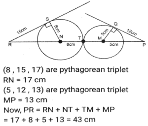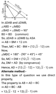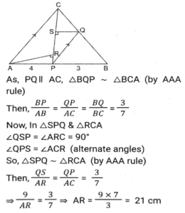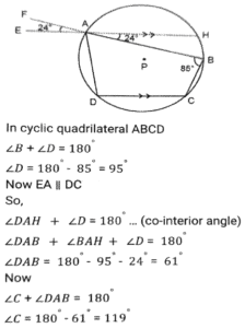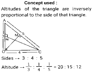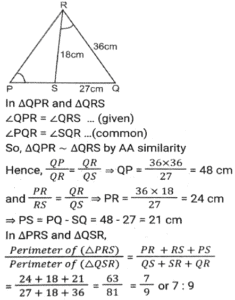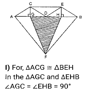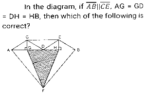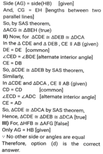 GeometryTotal Questions: 5011. In a triangle PQR, RS intersects PQ at point S. The sides of the triangle QR = 36 cm, SQ = 27 cm, RS = 18 cm and ∠QRS = ∠QPR. What is the ratio of the perimeter of △PRS to that of QSR? [SSC CHSL 10/07/2024 (3rd Shift)](a) 5/8(b) 7/9(c) 8/6(d) 9/12Correct Answer: (b) 7/9Solution:12. Solve it- [SSC CHSL 09/07/2024 (4th Shift)]I) △ACG ≅ △BEH II) △CDE ≅ △DEB ≅ △DCA III) △HFB ≅ △AFG(a) I, II and III(b) I and III(c) Only I(d) I and IICorrect Answer: (d) I and IISolution:13. ABC is a right-angled triangle, right angled at A in such a way that AB = AC and the bisector of angle B intersects the side AC at D. DM is perpendicular to BC, intersecting BC at M. If AB = 12 cm and BC = 12√2 cm, then find the length of side AD. [SSC CHSL 08/07/2024 (2nd Shift)](a)(b)(c)(d)Correct Answer: (b)Solution:14. Two circles with centres M and N have radii 5 cm and 8 cm, respectively. The circles touch each other externally at point T. A line PR is drawn such that the points M, T and N lie on PR, P being closer to M. From P, a tangent PQ = 12 cm is drawn to the circle with centre M touching at Q, and from R, another tangent RS = 15 cm is drawn to the circle with centre N touching at S. What is the length (in cm) of PR ? [SSC CHSL 04/07/2024 (3rd Shift)](a) 53(b) 43(c) 26(d) 37Correct Answer: (b) 43Solution:15. Two circles of radius 7 units each, intersect in such a way that the common chord is of length 7 units. What is the common area in square units of the intersection? [SSC CHSL 01/07/2024 (4th Shift)](a)(b)(c)(d)Correct Answer: (d)Solution:16. In a circle, ABCD is a cyclic quadrilateral in which AE is drawn parallel to CD, and BA is produced to F. If ∠ABC = 85º and ∠FAE = 24º find the value of ∠BCD. [SSC CHSL 01/07/2024 (2nd Shift)](a) 119º(b) 124º(c) 115º(d) 125ºCorrect Answer: (a) 119ºSolution:17. What is the length (in cm) of chord PQ in a circle with a radius of 7 cm, where a diameter AB and non-diameter chord PQ intersect perpendicularly at point C, and the ratio of AC to BC is 4: 3? [SSC CPO 28/06/2024 (2nd Shift)](a) 4√3(b) 8√3(c) 2√3(d) 6√3Correct Answer: (b) 8√3Solution:18. The angles of a triangle are in the ratio 1:2:3, then find the ratio of the corresponding sides. [SSC CPO 28/06/2024 (1st Shift)](a) 1 : 2 : √3(b) 1 : 2 : 3(c) 1 : √2 : 3(d) 1 : √3 : 2Correct Answer: (d) 1 : √3 : 2Solution:19. In ∆ABC, P is a point on AB such that PB:AP = 3:4 and PQ is parallel to AC. If AR and QS are perpendicular to PC and QS = 9 cm, what is the length (in cm) of AR? [SSC CPO 27/06/2024 (1st Shift)](a) 28(b) 35(c) 21(d) 14Correct Answer: (c) 21Solution:20. The lengths of the three sides of a triangle are given as 3 cm, 4 cm and 5 cm. The ratio of their corresponding altitudes to the opposite vertices will be: [Graduate Level 26/06/2024 (Shift-3)](a) 3 : 4 : 5(b) 9 : 8 : 7(c) 20 : 15 : 12(d) 5 : 4 : 3Correct Answer: (c) 20 : 15 : 12Solution:Submit Quiz« Previous12345Next »