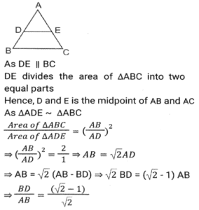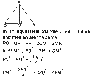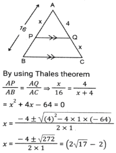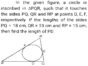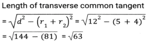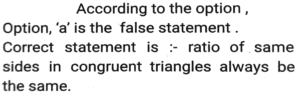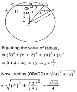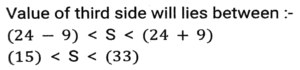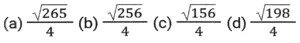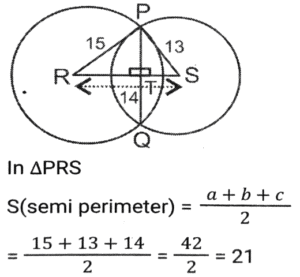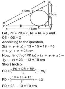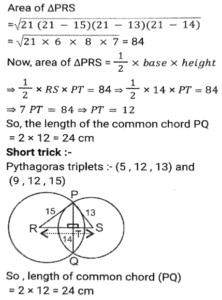 GeometryTotal Questions: 5031. A triangle PQR has three sides equal in measurement and if PM is perpendicular to QR, then which of following equality holds ? [SSC CHSL 04/08/2023 (2nd Shift)](a) 3PM² = 2PQ²(b) 3PQ² = 4PM²(c) 3PM² = 4PQ²(d) 3PQ² = 2PM²Correct Answer: (b) 3PQ² = 4PM²Solution:32. AB = 8 cm and CD = 6 cm are two parallel chords on the same side of the centre of a circle. If the distance between them is 2 cm, then the radius (in cm) of the circle is: [SSC CHSL 02/08/2023 (4th Shift)](a)(b)(c)(d)Correct Answer: (a)Solution:33. If the distance between the centres of two circles is 12 cm and the radii are 5 cm and 4 cm, then the length (in cm) of the transverse common tangent is : [SSC CHSL 02/08/2023 (2nd Shift)](a) 9(b) √143(c) √63(d) 7Correct Answer: (c) √63Solution:34. In △ABC , the straight line parallel to the side BC meets AB and AC at the points P and Q, respectively. If AP = QC the length of AB is 16 cm and the length of AQ is 4 cm, then the length (in cm) CQ is: [SSC CHSL 02/08/2023 (2nd Shift)](a)(b)(c)(d)Correct Answer: (c)Solution:35. The three sides of a triangle are 9, 24 and S units. Which of the following is correct? [SSC CHSL 02/08/2023 (1st Shift)](a) 15 < S < 33(b) 15 ≤ s < 33(c) 15 < S ≤ 33(d) 15 ≤ S ≤ 33Correct Answer: (a) 15 < S < 33Solution:36. If △ABC and triangle △DEF are congruent triangles, then which of the following is FALSE? [SSC CGL 24/07/2023 (3rd shift)](a) The ratio of AC to DF is 2:1.(b) The perimeter of both the triangles is equal.(c) AB = DE and BC = EF(d) The ratio of the angles in both the triangles is the same.Correct Answer: (a) The ratio of AC to DF is 2:1.Solution:37. The length of the common chord of two circles of radii 15 cm and 13 cm, whose centres are 14 cm apart, is: [SSC CGL 24/07/2023 (2nd shift)](a) 14cm(b) 12cm(c) 15cm(d) 24cmCorrect Answer: (d) 24cmSolution: 38. Explain it- [SSC CGL 21/07/2023 (1st shift)](a) 10cm(b) 8cm(c) 15 cm(d) 12cmCorrect Answer: (a) 10cmSolution:39. In a △ABC DE || BC, where D is a point on AB and E is a point on AC. If DE divides the area of △ABC into two equal parts, then DB: AB is equal to: [SSC CGL 20/07/2023 (4th shift)](a) √2 : √3(b) √2 : √2+1(c) √2+1 : 2(d) √2-1 : √2Correct Answer: (d) √2-1 : √2Solution:40. Explain it- [SSC CGL 20/07/2023 (1st shift)](a) 1.5 r²(b) 2.5 r²(c) 1/2 r²(d) 3 r²Correct Answer: (a) 1.5 r²Solution:Submit Quiz« Previous12345Next »