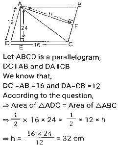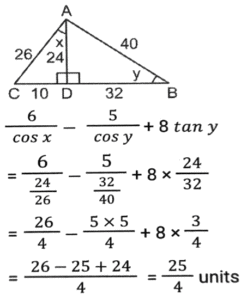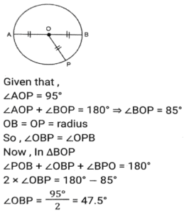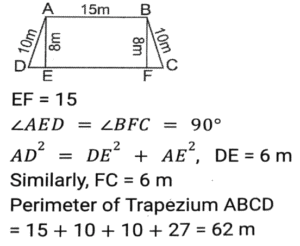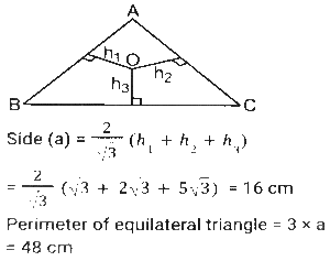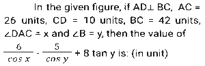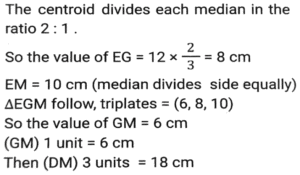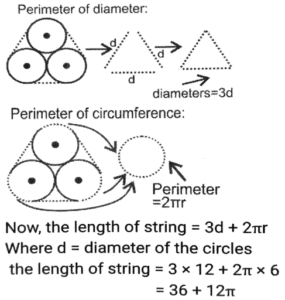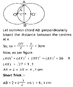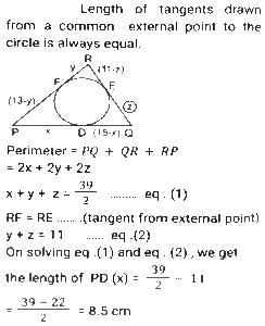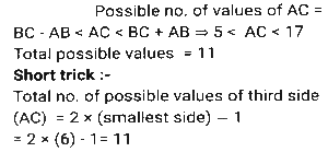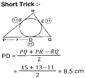 GeometryTotal Questions: 5041. Explain it- [SSC CGL 17/07/2023 (4th shift)](a) 16/9(b) 13/6(c) 25/4(d) 15/7Correct Answer: (c) 25/4Solution:42. AB is the diameter of a circle with centre O. P be a point on it. If ∠AOP = 95º, then ∠OBP =_______. [SSC CGL 14/07/2023 (3rd shift)](a) 57.5°(b) 45.5°(c) 47.5°(d) 55.5°Correct Answer: (c) 47.5°Solution:43. In a parallelogram, one of the parallel sides is 16 cm and the other side is 12 cm. If the perpendicular distance between the two parallel sides of dimension 16 cm is 24 cm, then the perpendicular distance between its other two parallel sides is: [Matriculation Level 27/06/2023 (Shift-2)](a) 16 cm(b) 12 cm(c) 32 cm(d) 24 cmCorrect Answer: (c) 32 cmSolution:44. Two medians DM and EN of triangle DEF intersect each other at Gat right angles. If EF = 20 cm and EN = 12 cm, then what is the length of DM ? (in cm) [SSC CHSL 16/03/2023 (3rd Shift)](a) 20(b) 12(c) 18(d) 15Correct Answer: (c) 18Solution: 45. In a triangle ABC, AB = 6 cm, BC = 11 cm. How many integral values of AC can be possible? [SSC CHSL 10/03/2023 (2nd Shift)](a) 10(b) 8(c) 12(d) 11Correct Answer: (d) 11Solution:46. Two circles of radius of 6 cm each. They intersect each other such that each passes through the centre of the other. What is the length of the common chord? [SSC CHSL 09/03/2023 (2nd Shift)](a) 9√3 cm(b) 12 cm(c) 6√3 cm(d) 8 cmCorrect Answer: (c) 6√3 cmSolution:47. In a trapezium ABCD, AB and DC are parallel to each other with a perpendicular distance of 8 m between them. Also, (AD) = (BC) = 10m and (AB) = 15m < (DC). What is the perimeter (in m) of the trapezium ABCD? [SSC CGL Tier II (07/03/2023)](a) 50(b) 66(c) 62(d) 58Correct Answer: (c) 62Solution:48. 'O' is a point in the interior of an equilateral triangle. The perpendicular distance from 'O' to the sides are 3 cm, 2√3cm, 5√3cm. The perimeter of the triangle is: [SSC CGL 13/12/2022 (4th Shift)](a) 48 cm(b) 32 cm(c) 24 cm(d) 64 cmCorrect Answer: (a) 48 cmSolution:49. Three circles of radius 6 cm are kept touching each other. The string is tightly tied around these three circles. What is the length of the string? [SSC CGL 03/12/2022 (2nd Shift)](a) 36 + 18π cm(b) 36 + 12π cm(c) 24 + 36π cm(d) 36 + 20π cmCorrect Answer: (a) 36 + 18π cmSolution:50. In the given figure, a circle is inscribed in △PQR such that it touches the sides PQ, QR and RP at points D, E, F, respectively. If the lengths of the sides PQ = 15 cm, QR = 11 cm and RP = 13cm then find the length of PD. [SSC CGL 02/12/2022 (1st Shift)](a) 9 cm(b) 8 cm(c) 7.5 cm(d) 8.5 cmCorrect Answer: (d) 8.5 cmSolution:Submit Quiz« Previous12345
