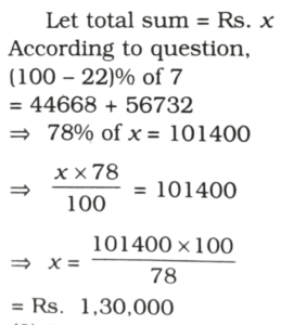 Haryana Constable Exam 01.11.2021 (Morning Shift-II)Total Questions: 10041. Usually the email address is in(1) Lower case(2) Upper case(3) Proper case(4) All of theseCorrect Answer: (4) All of theseSolution:The email addresses are not case sensitive.Usernames often contain both upper-case and lower-case letters and may also contain numbers, underscores, or pes, or periods.42. Select the correct mirror of the given figure when the mirror is placed in line AB.(1)(2)(3)(4)Correct Answer: (4)Solution:f43. Bovina spent Rs. 44,668 on her air tickets, Rs. 56,732 on buying gifts for the family members and the remaining 22% of the total amount she had as cash with her What was the total amount?(1) Rs. 28,600(2) Rs. 33,800(3) Rs. 1,01,400(4) Rs. 1,30,000Correct Answer: (4) Rs. 1,30,000Solution:44. Military exercise of AUSINDEX is associated between Indian and(1) US(2) Japan(3) Australia(4) ChinaCorrect Answer: (3) AustraliaSolution:In September 2021, India and Australia participated in the 4th edition of AUSINDEX Naval Exercise.It is a major biennial bilateral exercise, first held in India in 2015.It aims to consolidate shared commitment to regional and global security challenges promoting peace, security and stability in the Indo-Pacific region.45. If we divide the National Income of country by total population then we get(1) Personal disposable inanibose(2) Per capita income(3) Personal income(4) Private incomeCorrect Answer: (2) Per capita incomeSolution:By dividing the total income of the nation by its total population, we obtain the average income, also known as per capita income. Per capita generally means per person. It is known as a Latin term that translates to "by the head."46. Complaints to Magistrates contained in(1) Chapter XIII of Criminal Procedure Code(2) Chapter XVI of Criminal Procedure Code(3) Chapter XV of Criminal Procedure Code(4) Chapter XIV of Criminal Procedure CodeCorrect Answer: (3) Chapter XV of Criminal Procedure CodeSolution:The Criminal Procedure Code 1973, at present, con-tains 565 sections, 5schedules and 56 forms. The sections are divided into 46 chapters.The Chapter XV of CRPC contains provisions relating to complaints to magistrates.47. National Animal Disease Control Programme for Foot and Mouth Diseases (FMD) and Brucellosis (NADCP) Scheme through vaccination by the year(1) 2030(2) 2035(3) 2050(4) 2040Correct Answer: (1) 2030Solution:In 2019, the Prime Minister launched the National Animal Disease Control Programme (NADCP), to control and eradicate the Foot & Mouth Disease (FMD) and Brucellosis amongst the live-stock in the country, at Mathura.It aims to control the livestock diseases by 2025, and eradicate them by 2030.The livestock that will be covered under the programme includes cattle, buffalo, sheep, goats, and pigs against the FMD.48. The sum of series, (-1000) + (-900) + (-800) + ... +1100 + 1200 is(1) 0(2) 1200(3) 2200(4) 2300Correct Answer: (4) 2300Solution:49. Under unfavourable condition many zooplankton species in lal...and ponds are known to enter_____ a stage of suspended development.(1) Conform(2) Diapause(3) Migrate(4) DormantCorrect Answer: (2) DiapauseSolution:Some organisms, migrate from the unfavourable place to the place with favourable conditions.Some organisms, unable to migrate, might avoid the stress by escaping in time.so by reducing their metabolic activity and going into a state of 'dormancy'Under unfavourable conditions many zooplankton species in lakes and ponds are known to enter diapause, a stage of suspended development.50. Material culture consists of manmade objects which are_____ in nature.(1) Tangible(2) Concrete(3) Abstract(4) Both (1) and (2)Correct Answer: (2) ConcreteSolution:Material culture refers to the physical objects, resources, and spaces that people use to define their culture.These include homes, neighborhoods, cities, schools, churches, synagogues, temples, mosques, offices, factories and plants, tools, means of production, goods and products, stores, and so forth.Submit Quiz« Previous12345678910Next »
