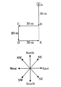 4. A man walks 30 metres to-wards South, then turning to his right, he walks 30 metres. then turning to his left, he walks 20 metres, again turing to his left, he walks 30 meters. How far is he from his start-ing point?