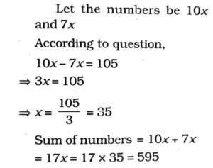6. The ratio of two numbers is 10:7 and their difference is 105. The sum of these numbers is od 150