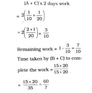 7. A can complete a piece of work in 10 days, B in 15 days and C in 20 days, A and C worked together for two days and then A was replaced by B. In how many days, altogether, work was completed?