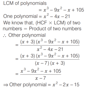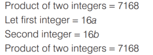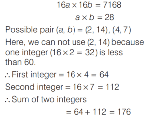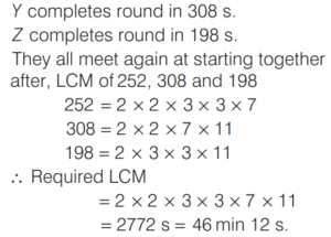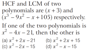 HCF AND LCM OF NUMBERS AND POLYNOMIALS (CDS)Total Questions: 311. HCF of two numbers is 12. Which one of the following can never be their LCM? [2019 (II) Evening Shift ](a) 80(b) 60(c) 36(d) 24Correct Answer: (a) 80Solution:HCF of two numbers is 12. LCM is common multiple for the two numbers. So, the required answer is 80 because all other are multiple of 12.2. X Y, and Z start at same point and same time in the same direction to run around a circular stadium. X completes a round in 252 s, Y in 308 s and Z in 198 s. After what time will they meet again at the starting point? [2019 (II) Evening Shift ](a) 26 min 18 s(b) 42 min 36 s(c) 45 min(d) 46 min 12 sCorrect Answer: (d) 46 min 12 sSolution:X completes round in 252 s.3. Simplify the question [2019 (II) Evening Shift ](a)(b)(c)(d)Correct Answer: (d)Solution: 4. Solve the following equation [2019 (II) Evening Shift ](a)(b)(c)(d)Correct Answer: (a)Solution:Let p = x³ + 3x² + 3x + 1 = (x + 1)³5. The highest four-digit number which is divisible by each of the numbers 16, 36, 45, 48 is [2019 (II) Evening Shift ](a) 9180(b) 9360(c) 9630(d) 9840Correct Answer: (b) 9360Solution:Number which is divisible by 16, 36, 45 and 48 = LCM of (16, 36, 45, 18) LCM of 16, 36, 45, 48 = 720 Now, highest four digit number = 99996. Simplify the question [2019 (II) Evening Shift ](a)(b)(c)(d)Correct Answer: (c)Solution:Given, HCF of polynomials = x + 37. The product of two integers p and q, where p > 60 and q > 60, is 7168 and their HCF is 16. The sum of these two integers is [2019 (II) Evening Shift ](a) 256(b) 184(c) 176(d) 164Correct Answer: (c) 176Solution:Given, HCF = 16 8. There are two numbers which are greater than 21 and their LCM and HCF are 3003 and 21 respectively. What is the sum of these numbers? [2018 (I) Morning Shift ](a) 504(b) 508(c) 514(d) 528Correct Answer: (a) 504Solution:The LCM and HCF of two numbers which are greater than 21 are 3003 and 21 respectively.9. The product of two non-zero expressions is (x + y + z) p³. If their HCF is p², then their LCM is [2017 (II) Evening Shift ](a) (x + y + z)(b) (x + y + z)p²(c) (x + y + z)p⁵(d) (x + y + z)pCorrect Answer: (d) (x + y + z)pSolution:We know that, Product of two numbers = LCM of two numbers × HCF of two numbers ∴ (x + y + z)p³ = p² × LCM LCM = (x + y + z)p10. Consider the following statements [2017 (I) Morning Shift ]1. If a = bc with HCF (b,c) = 1, then HCF (c, bd) = HCF (c, d). 2. If a = bc with HCF (b, c) = 1, then LCM (a, d) = LCM (c, bd).Which of the above statements is / are correct?(a) Only 1(b) Only 2(c) Both 1 and 2(d) Neither 1 nor 2Correct Answer: (c) Both 1 and 2Solution:1. If a = bc with HCF (b, c) = 1Submit Quiz1234Next »