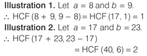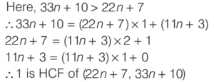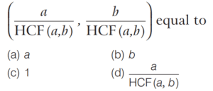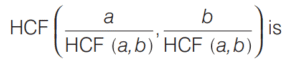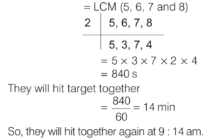 HCF AND LCM OF NUMBERS AND POLYNOMIALS (CDS)Total Questions: 3121. The LCM of two integers is 1237. What is their HCF? [2014 (II) Evening Shift ](a) 37(b) 19(c) 1(d) Cannot be determinedCorrect Answer: (c) 1Solution:Given, LCM of two integers is 1237, which is a prime number. So, their HCF is 1.22. There are 48 cricket balls, 72 hockey balls and 84 tennis balls and they have to be arranged in several rows in such a way that every row contains the same number of balls of one type. What is the minimum number of rows required for this to happen? [2014 (II) Evening Shift ](a) 12(b) 16(c) 17(d)19Correct Answer: (c) 17Solution:Given number of cricket balls = 48 = 2⁴ × 323. The HCF of two natural numbers m and n is 24 and their product is 552. How many sets of values of m and n are possible? [2014 (II) Evening Shift ](a) 1(b) 2(c) 4(d) No set of m and n is possible satisfying the given conditionsCorrect Answer: (d) No set of m and n is possible satisfying the given conditionsSolution:Given HCF of two natural numbers m and n = 2424. What is the highest common factor of 2x³ + x² - x - 2 and 3x³ - 2x² + x - 2 ? [2014 (II) Evening Shift ](a) x - 1(b) x + 1(c) 2x + 1(d) 2x - 1Correct Answer: (a) x - 1Solution:Let f(x) = 2x³ + x² - x - 225. The LCM of two numbers is 90 times their HCF. The sum of LCM and HCF is 1456. If one of the numbers is 160, then what is the other number? [2014 (II) Evening Shift ](a) 120(b) 136(c) 144(d) 184Correct Answer: (c) 144Solution:Let the HCF of two numbers be x.26. What is the number of integral solutions of the equations HCF (a, b) = 5 and a + b = 65? [2014 (I) Morning Shift ](a) None(b) Infinitely many(c) Less than 65(d) Exactly oneCorrect Answer: (c) Less than 65Solution:∵ HCF (a, b) = 527. If a and b are positive integers, then what is HCF [2014 (I) Morning Shift ](a)(b)(c)(d)Correct Answer: (c)Solution: 28. For any integers ‘a’ and ‘b’ with HCF(a, b) = 1, what is HCF (a + b, a - b) equal to? [2014 (I) Morning Shift ](a) It is always 1(b) It is always 2(c) Either 1 or 2(d) None of theseCorrect Answer: (c) Either 1 or 2Solution:HCF (a + b, a - b) is either 1 or 229. For any integer n, what is HCF (22n + 7, 33n + 10) equal to? [2014 (I) Morning Shift ](a) n(b) 1(c) 11(d) None of the aboveCorrect Answer: (b) 1Solution:Apply Euclidean algorithm on (22n + 7, 33n + 10),30. In a fire range, 4 shooters are firing at their respective targets. The first, the second, the third and the fourth shooters hit the target once in every 5 s, 6 s, 7 s and 8 s, respectively. If all of them hit their target at 9 : 00 am, when will they hit their target together again? [2014 (I) Morning Shift ](a) 9 : 04 am(b) 9 : 08 am(c) 9 : 14 am(d) None of theseCorrect Answer: (c) 9 : 14 amSolution:Time after which they will hit the target again togetherSubmit Quiz« Previous1234Next »