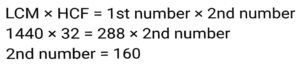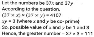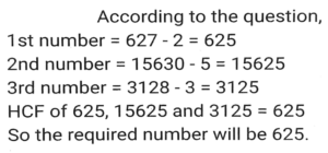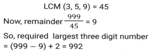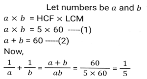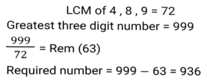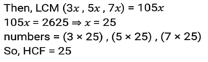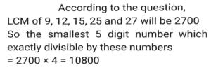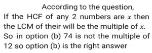 HCF and LCM (Part-2)Total Questions: 5411. If the sum of two numbers is 60 and their HCF and LCM are 5 and 60, respectively, then the sum of the reciprocals of the numbers will be:(a)(b)(b)(c)Correct Answer: (b)Solution:12. The least number of five digits which is exactly divisible by 9, 12, 15, 25 and 27 is: [SSC CPO 05/10/2023 (3rd Shift)](a) 10250(b) 10800(c) 10600(d) 10700Correct Answer: (b) 10800Solution:13. What is the largest number that divides 627, 15630 and 3128 and leaves remainders of 2, 5 and 3, respectively? [SSC MTS 04/09/2023 (3rd Shift)](a) 775(b) 650(c) 625(d) 1225Correct Answer: (c) 625Solution:14. The HCF of three numbers is 57. If they are in the ratio of 4 : 5 : 6, then find the numbers. [SSC MTS 05/09/2023 (2nd Shift)](a) 228, 285, 342(b) 236, 295, 354(c) 240, 300, 360(d) 232, 290, 348Correct Answer: (a) 228, 285, 342Solution:15. Three numbers are in the ratio 3 : 5 : 7 If their LCM is 2625, find their HCF [SSC MTS 05/09/2023 (3rd Shift)](a) 100(b) 125(c) 50(d) 25Correct Answer: (d) 25Solution:16. The largest three-digit number which gives the same remainder 2 when divided by 3, 5 and 9 is________ . [SSC MTS 08/09/2023 (1st Shift)](a) 980(b) 992(c) 995(d) 990Correct Answer: (b) 992Solution:17. The HCF of two numbers is 12. Which of the following can never be their LCM? [SSC MTS 12/09/2023 (1st Shift)](a) 24(b) 74(c) 48(d) 60Correct Answer: (b) 74Solution:18. The product of two numbers in 4107. If the HCF of these numbers is 37, then the greater number is: [SSC MTS 12/09/2023 (2nd Shift)](a) 111(b) 74(c) 185(d) 37Correct Answer: (a) 111Solution:19. The LCM of the two numbers is 1440 and their HCF is 32. If the first number is 288, then find the second number. [SSC MTS 13/09/2023 (2nd Shift)](a) 150(b) 145(c) 180(d) 160Correct Answer: (d) 160Solution:20. What is the greatest three-digit number which when divided by 4, 8 and 9, leaves no remainder? [SSC MTS 13/09/2023 (3rd Shift)](a) 924(b) 963(c) 932(d) 936Correct Answer: (d) 936Solution:Submit Quiz« Previous123456Next »