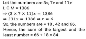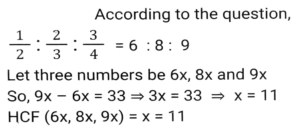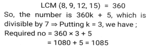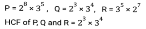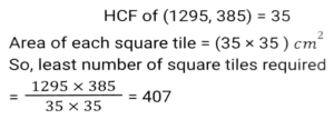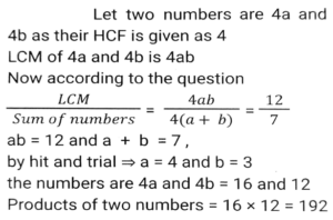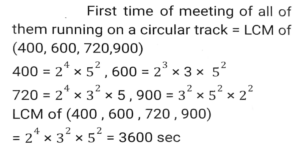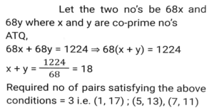 HCF and LCM (Part-2)Total Questions: 5441. The sum of two numbers is 1224 and their HCF is 68. The number of pairs of numbers satisfying the above condition is: [SSC CPO 09/11/2022 (Afternoon)](a) 3(b) 4(c) 6(d) 2Correct Answer: (a) 3Solution:42. The LCM and ratio of three numbers are 1386 and 3 : 7 : 11, respectively. The sum of the greatest and least numbers is: [SSC CPO 11/11/2022 (Evening)](a) 60(b) 64(c) 84(d) 108Correct Answer: (c) 84Solution:43. If P = 2⁸ × 3⁵ × , Q = 2³ × 3⁴, and R = 3⁵ × 2⁷, then what is the highest common factor of P, Q and R?(a) 2³ × 3⁴(b) 2⁸ × 3⁵(c) 2² × 3²(d) 2⁴ × 3⁵Correct Answer: (a) 2³ × 3⁴Solution:44. The ratio of the LCM of two numbers to the sum of the same two numbers is 12 : 7. If their HCF is 4, what is the product of these two numbers? [SSC MTS 14/07/2022 (Morning)](a) 192(b) 172(c) 196(d) 160Correct Answer: (a) 192Solution:45. If K₁ and K₂ are two distinct prime numbers, then what is the product of the highest common factor and the least common multiple of K₁ and K₂? [SSC MTS 20/07/2022 (Afternoon)](a)(b)(c)(d)Correct Answer: (d)Solution:46. Find the smallest natural number 'x' that must be subtracted from 1800 so that (1800x), when divided by 7, 11 and 23, will leave 5 as the remainder in each case. [SSC MTS 26/07/2022 (Evening)](a) 24(b) 25(c) 26(d) 20Correct Answer: (a) 24Solution:LCM of 7, 11 and 23 = 1771 Remainder in each case = 5 So, required number = 1771 + 5 = 1776 Value of x = 1800 - 1776 = 2447. Four runners started running simultaneously from a point on a circular track. They took 400 seconds, 600 seconds, 720 seconds and 900 seconds to complete one round. After how much time did they meet at the starting point for the first time since the race started? [SSC CHSL 03/06/2022 (Morning)](a) 4200 sec(b) 2400 sec(c) 3600 sec(d) 1800 secCorrect Answer: (c) 3600 secSolution:48. Which is the smallest multiple of 7, which leaves 5 as a remainder in each case, when divided by 8, 9, 12 and 15? [SSC CGL 12/04/2022 (Morning)](a) 365(b) 1085(c) 2525(d) 725Correct Answer: (b) 1085Solution:49. Three numbers are in the ratio 1/2 : 2/3 : 3/4. If the difference between the greatest number and the smallest number is 33, then HCF of the three numbers is: [SSC CGL Tier II (03/02/2022)](a) 9(b) 5(c) 13(d) 11Correct Answer: (d) 11Solution:50. The least number of square tiles required to pave the ceiling of a room 12 m 95 cm long and 3 m 85 cm broad, is: [SSC MTS 11/10/2021 (Afternoon)](a) 417(b) 407(c) 467(d) 437Correct Answer: (b) 407Solution:Submit Quiz« Previous123456Next »