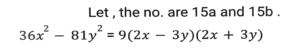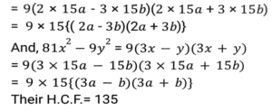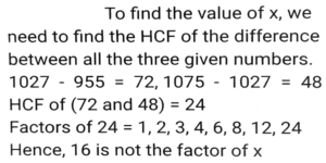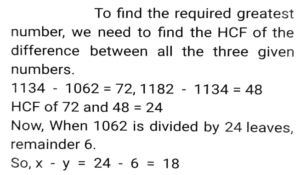 HCF and LCM (Part-2)Total Questions: 5451. What is the sum of the digits of the least number which when divided by 15, 18 and 36 leaves the same remainder 9 in each case and is divisible by 11? [SSC CPO 25/11/2020 (Morning)](a) 18(b) 16(c) 17(d) 15Correct Answer: (a) 18Solution:52. When 1062, 1134 and 1182 are divided by the greatest number x, the remainder in each case is y. What is the value of (x - y)? [SSC CGL Tier II (15/11/2020)](a) 19(b) 17(c) 16(d) 18Correct Answer: (d) 18Solution:53. Let x be the greatest number which when divided by 955, 1027, 1075, the remainder in each case is the same. Which of the following is NOT a factor of x ? [SSC CGL Tier II (16/11/2020)](a) 6(b) 16(c) 4(d) 8Correct Answer: (b) 16Solution:54. If the highest common factor (HCF) of x and y is 15, then the HCF of 36x² - 81y² and 81x² - 9y² is divisible by [SSC CGL Tier II (06/03/2023)](a) 135(b) 120(c) 180(d) 90Correct Answer: (a) 135Solution:Submit Quiz« Previous123456