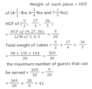 HCF and LCM – Railway Maths Part ⅤTotal Questions: 4841. The LCM of two numbers is 96 and their HCF is 8. If one of the two numbers is 32, then what is the other number? [RRB NTPC 08/02/2021 (Evening)](a) 28(b) 16 (c) 48(d) 24Correct Answer: (d) 24Solution:Product of two numbers = HCF × LCM⇒ 32 × 2nd number = 8 × 96⇒ 2nd number = (8 × 96) / 32 = 2442. The product of the LCM and HCF of two positive numbers is 36. The difference of the two numbers is 5. Find the numbers. [RRB NTPC 09/02/2021 (Evening)](a) 5 and 8(b) 5 and 9(c) 4 and 9(d) 4 and 8Correct Answer: (c) 4 and 9Solution:Product of two numbers = HCF × LCM = 36Let the numbers be a and bab = 36And a − b = 5 ⇒ a = 5 + bPut the value of ‘a’ in the first equation(5 + b) b = 36 = 9 × 4On comparing both sides, we getb = 4a = 5 + 4 = 943. The LCM of two numbers is 26 times their HCF. The sum of the HCF and LCM is 729. If one number is 81. Find the other. [RRB NTPC 09/02/2021 (Evening)](a) 233 (b) 232 (c) 234(d) 231Correct Answer: (c) 234Solution:Let the HCF = x, LCM = 26xAnd x + 26x = 729⇒ 27x = 729 ⇒ x = 27HCF = 27 and LCM = 702Product of two numbers = HCF × LCM⇒ 81 × 2nd number = 27 × 7022nd number = (27 × 702) / 81 = 23444. The HCF of two numbers is 29 and the other two factors of their LCM are 13 and 17. The smallest of the two numbers is: [RRB NTPC 09/02/2021 (Evening)](a) 493 (b) 373(c) 377 (d) 387Correct Answer: (c) 377 Solution:Smaller number = 13 × 29 = 37745. The LCM of two co-prime numbers is 638. If one number is 29, then the other number is. [RRB NTPC 11/02/2021 (Morning)](a) 32(b) 22(c) 11(d) 13Correct Answer: (b) 22Solution:HCF of co-prime numbers = 1Product of two numbers = LCM × HCF⇒ 29 × 2nd number = 638 × 1⇒ 2nd number = 638 / 29 = 2246. Three whole cakes weigh 4½ lbs, 6¾ lbs and 7⅕ lbs, respectively. Each cake has to be divided into pieces of equal weight. Each piece must be as heavy as possible. If one such piece is served to each guest, then what are the maximum number of guests that can be served? [RRB NTPC 11/02/2021 (Morning)](a) 54(b) 72(c) 45(d) 41Correct Answer: (d) 41Solution:47. What is the greatest number that will divide 38, 45, 52 and leave as remainders 2, 3, and 4 respectively? [RRB NTPC 11/02/2021 (Evening)](a) 6 (b) 7 (c) 9 (d) 5Correct Answer: (a) 6 Solution:The remainders are = 2, 3, 438 − 2 = 3645 − 3 = 4252 − 4 = 48HCF of (36, 42, 48) = 648. The LCM of 248 and 868 is 1736. What is the HCF?(a) 248(b) 1736(c) 868 (d) 124Correct Answer: (d) 124Solution:Given, 1st number = 248,2nd number = 868, LCM = 1736The product of two number = HCF × LCM248 × 868 = HCF × 1736HCF = 124Submit Quiz« Previous12345