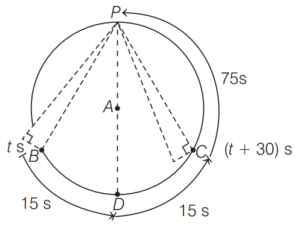 2. A plane is going in circles around an airport. The plane takes 3 min to complete one round. The angle of elevation of the plane from a point P on the ground at time t is equal to that at time (t + 30) s. At time (t + x) s, the plane flies vertically above the point P. What is x equal to? [2019 (I) Morning Shift]