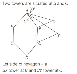 3. Consider a regular hexagon ABCDEF. Two towers are situated at B and C. The angle of elevation from A to the top of the tower at B is 30°, and the angle of elevation to the top of the tower at C is 45°. What is the ratio of the height of towers at B and C? [2019 (I) Morning Shift]