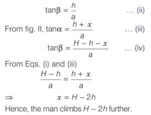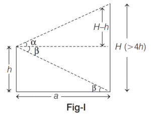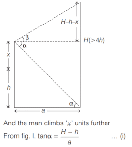 6. From a height of h units, a man observes the angle of elevation as α and angle of depression as β of the top and the bottom respectively of a tower of height H (> 4h). To what further height should he climb so that the values of angle of elevation and angle of depression get interchanged for the top and bottom of the tower? [2018 (I) Morning Shift]